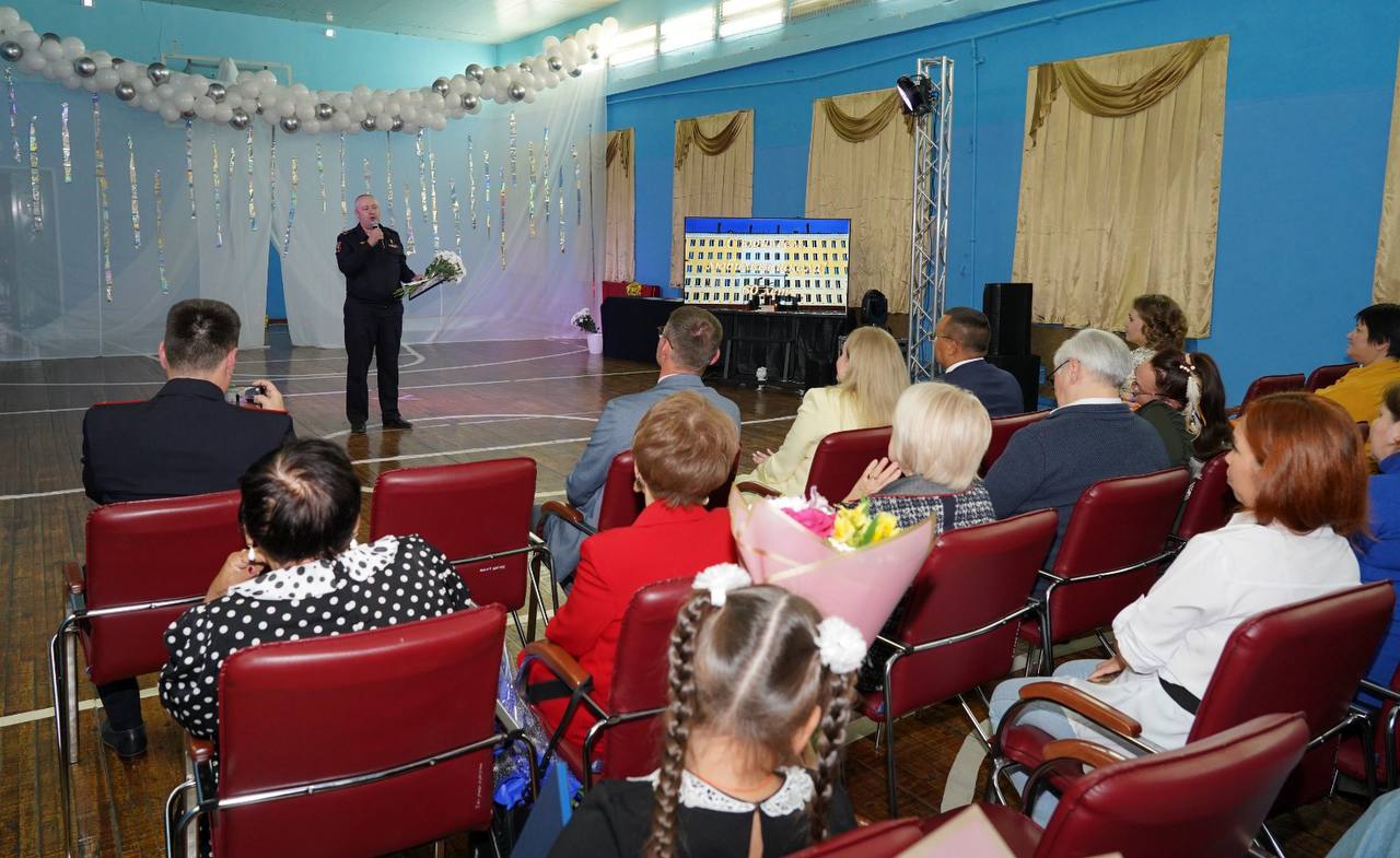 Виталий Викторович лично вручил директору школы Марине Терниковой цветы и поздравительный адрес.