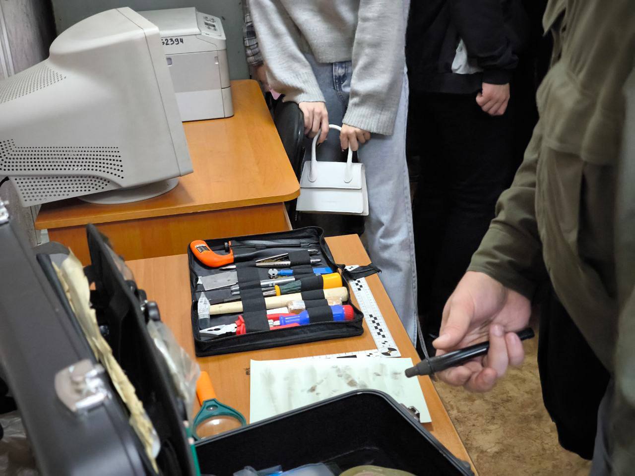 Работа эксперта-криминалиста: сотрудник экспертно-криминалистического отдела Игорь Волдыков продемонстрировал свой волшебный чемоданчик. Ребята во всех подробностях узнали, как изымают отпечатки пальцев с помощью специальных порошков.