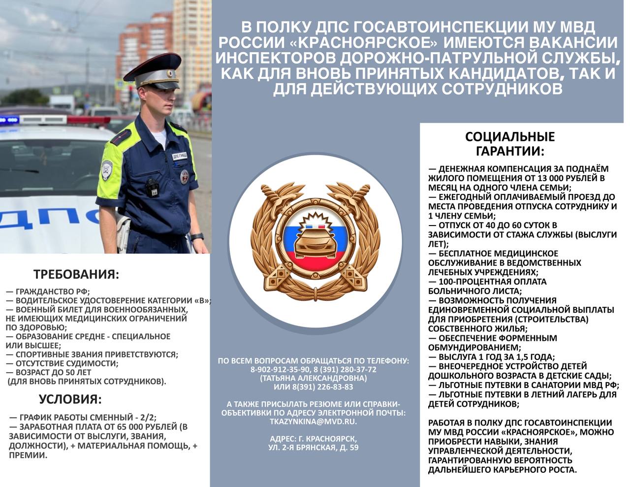 В красноярском полку ДПС имеются вакансии инспекторов дорожно-патрульной службы