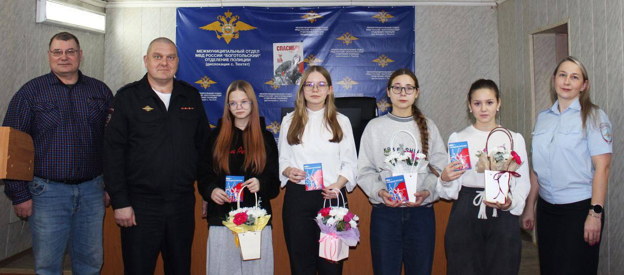 В отделении полиции (дислокация с. Тюхтет) МО МВД России «Боготольский» в рамках всероссийской программы «Мы — граждане России» от «Движения Первых» прошла торжественная церемония вручения паспортов с участием начальника отделения полиции МО МВД России «Боготольский» майор полиции Роман Иванов, главный специалист – эксперт миграционного пункта ОП МО МВД России «Боготольский» Николай Соболев, а также исполняющая обязанности директора МБУ ММЦ «Успех» Ульяна Швед. Четыре юные жительницы, достигшие 14-летнего возраста, получили свой главный документ. Получение паспорта — это всегда волнующий момент, новая ступень и новая ответственность.