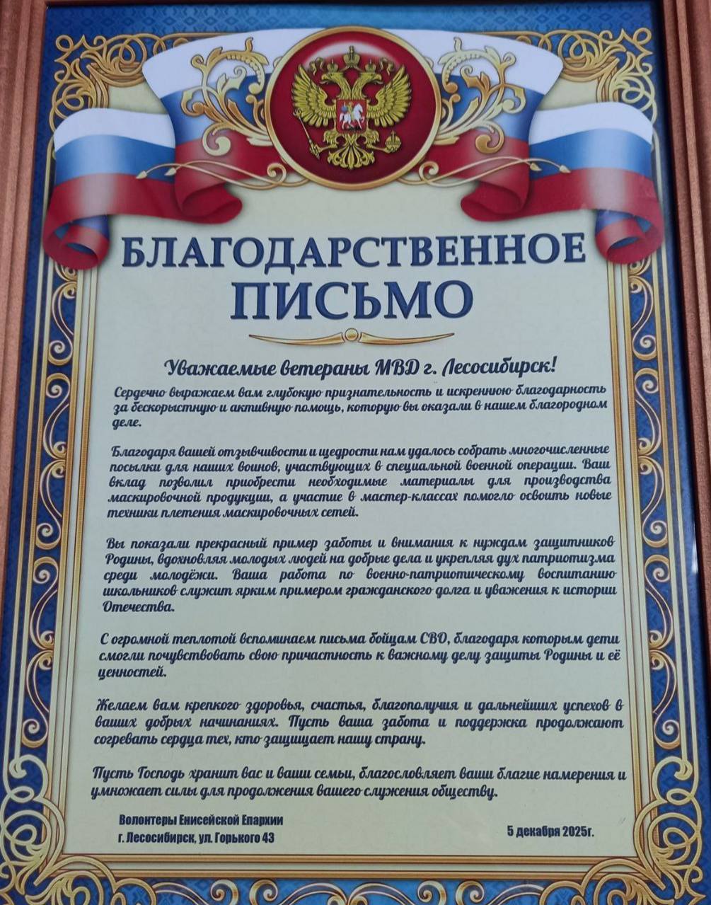 Настоящая поддержка всегда идёт от сердца. Ветеранскую организацию ОМВД России по г. Лесосибирску поблагодарили волонтёры Енисейской епархии за помощь в важном деле — изготовлении маскировочных сетей для наших бойцов.