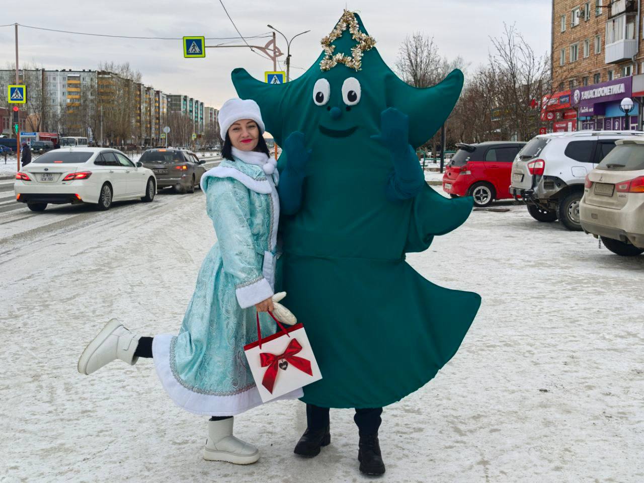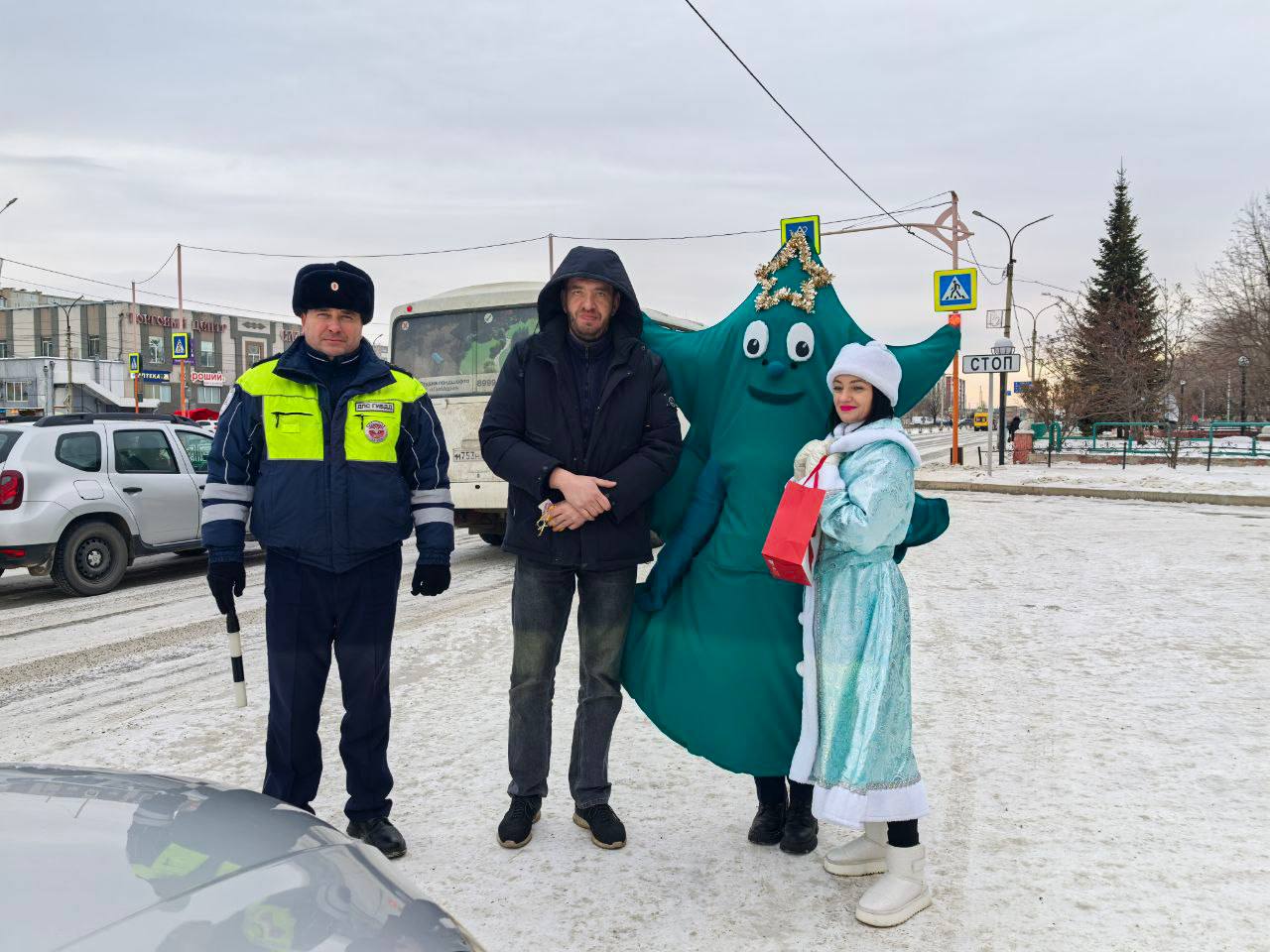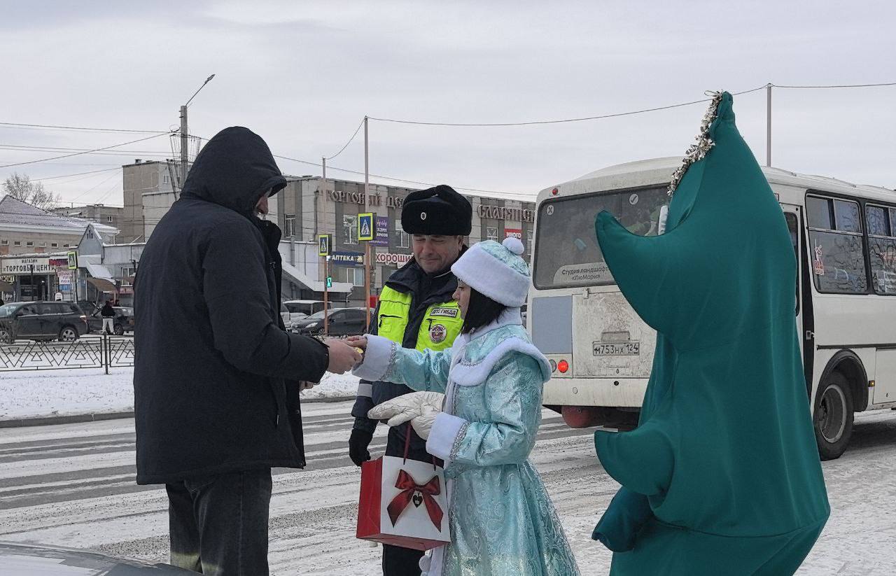 Экипаж ДПС вышел в рейд с новогодним настроением командир взвода проверял документы, а Снегурочка и Ёлочка вручали «варежки безопасности» с напоминанием о ПДД и поздравлениями с наступающим