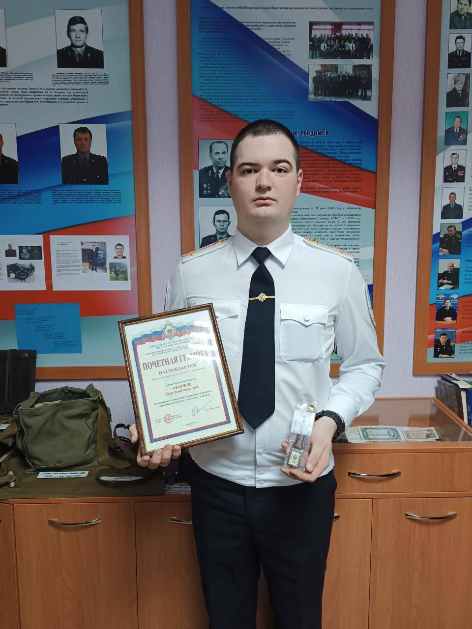 На планерке личного состава состоялось торжественное вручение награды старшему лейтенанту полиции Егору Шаляеву, старшему участковому уполномоченному полиции.