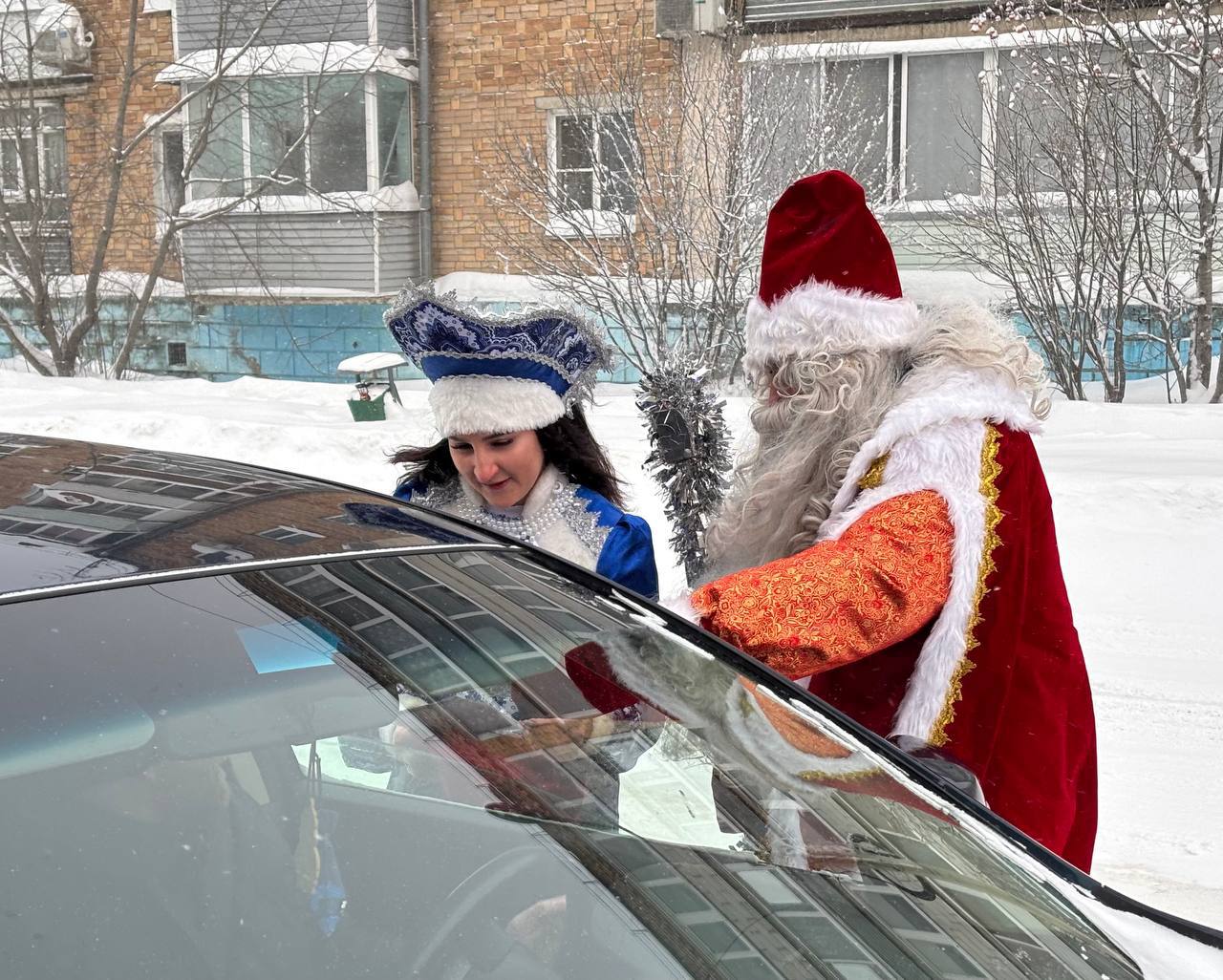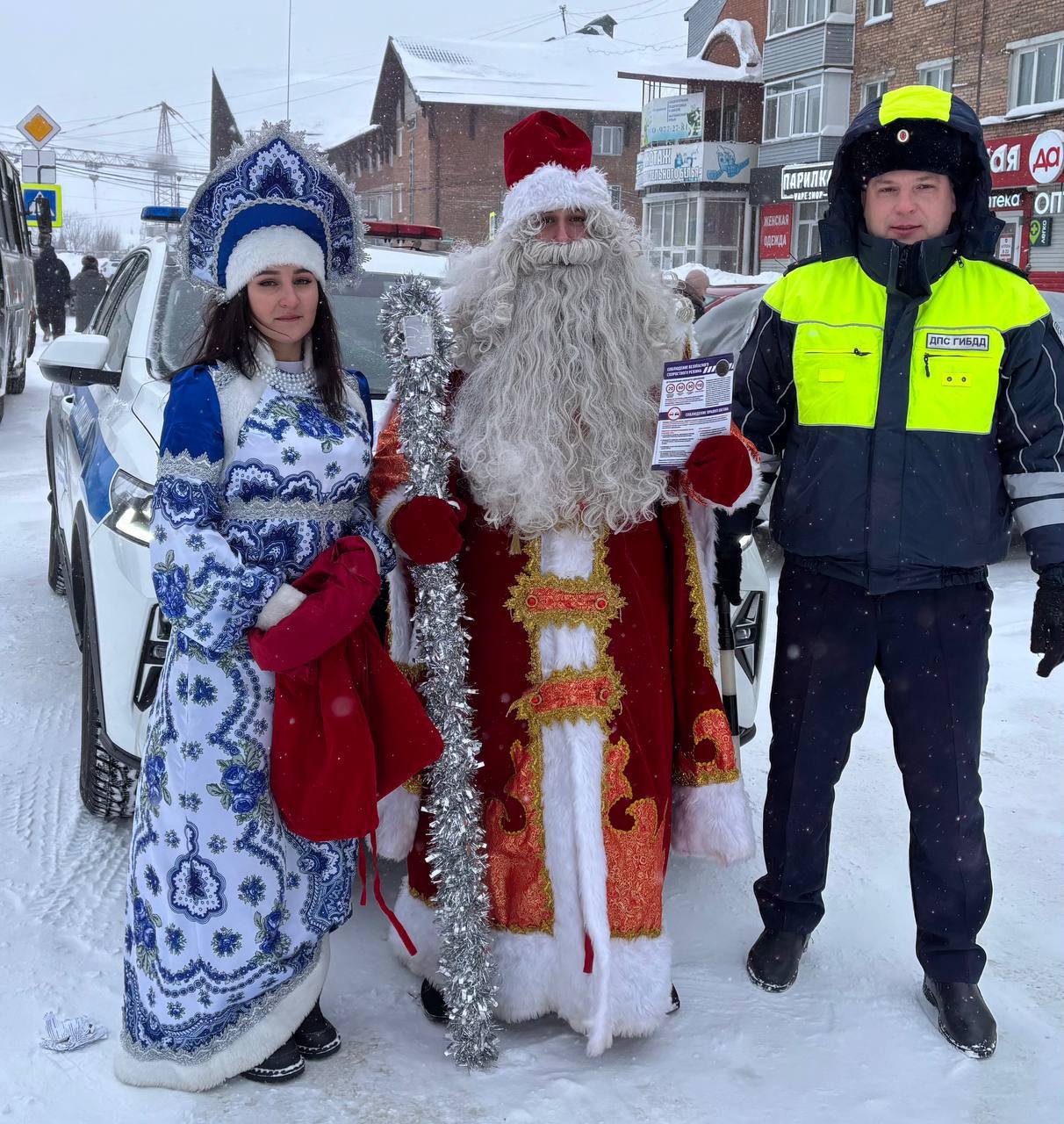 В Лесосибирске необычный патруль вместе с сотрудниками Госавтоинспекции на дороги вышли Дед Мороз и Снегурочка.