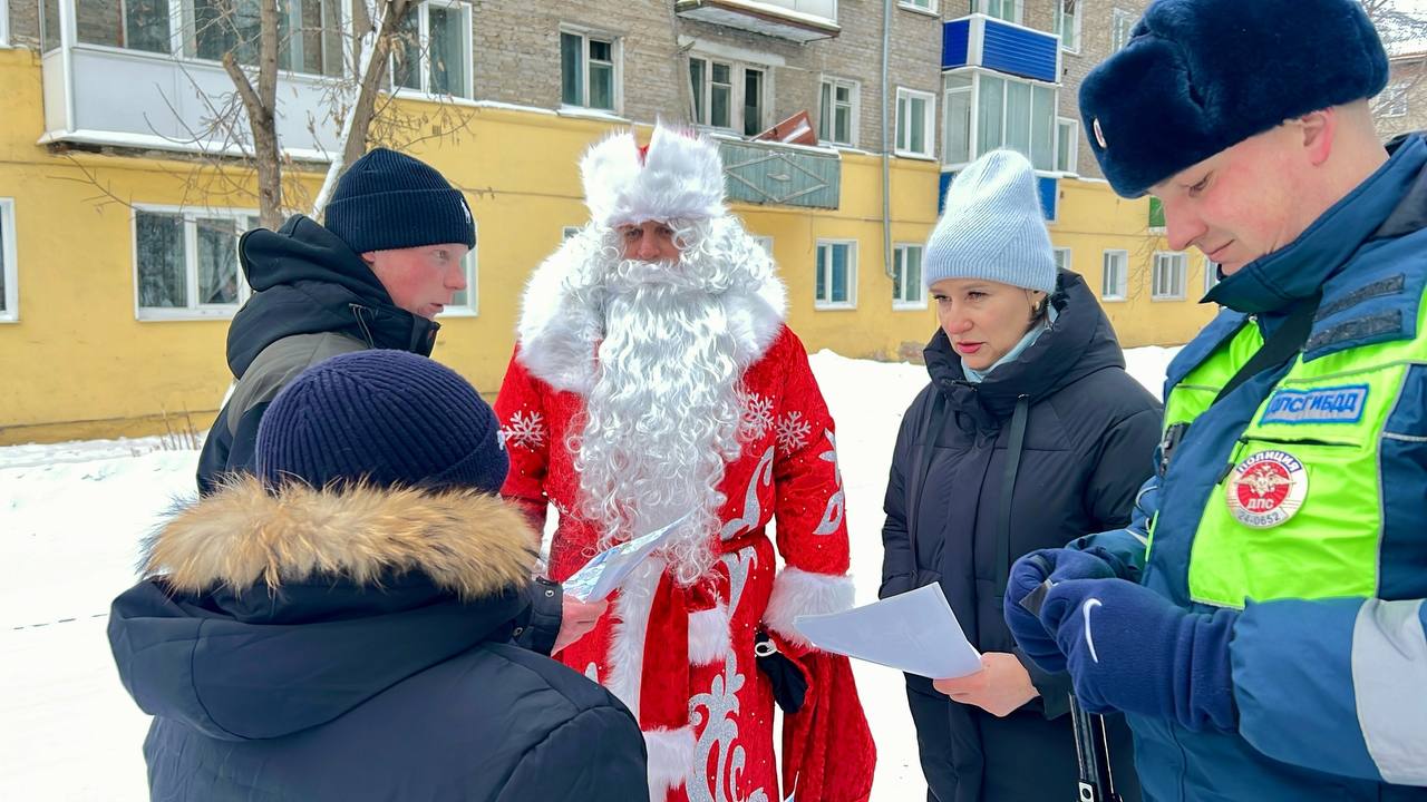 Главную роль в новогоднем представлении исполнил начальник отделения Госавтоинспекции Игорь Бурин, преобразившийся в сказочного Деда Мороза. В компании инспекторов ДПС и общественницы он отправился в праздничное путешествие по городским улицам и загородным автозаправочным станциям.