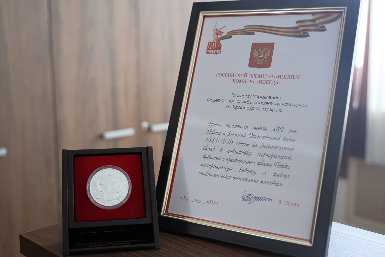 Медаль от имени Президента Российской Федерации Владимира Путина вручена коллективу ГУФСИН России по Красноярскому краю за значительный вклад в подготовку мероприятий, связанных с празднованием юбилея Победы, мемориальную работу, а также патриотическое воспитание молодежи.