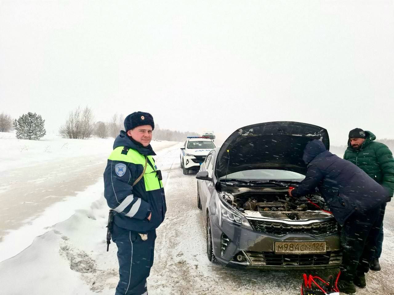 Сотрудники ДПС организовали доставку водителя, путем попутного транспорта в ближайший магазин за исправным аккумулятором.