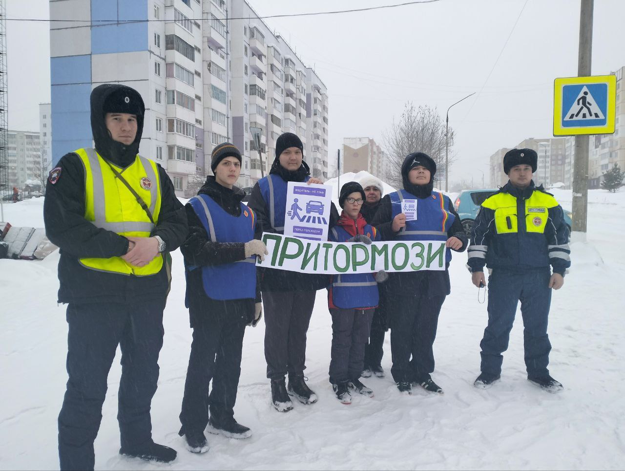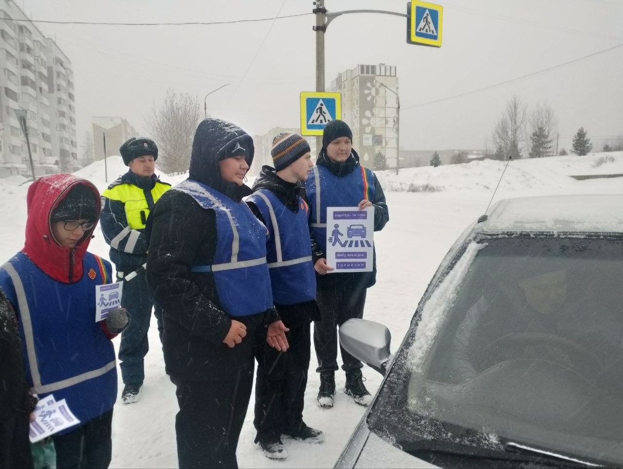 В день акции юные инспекторы движения под руководством госавтоинспекторов и педагогов беседовали с водителями о том, что очень важно своевременно сбавлять скорость ещё не доезжая до пешеходного перехода.