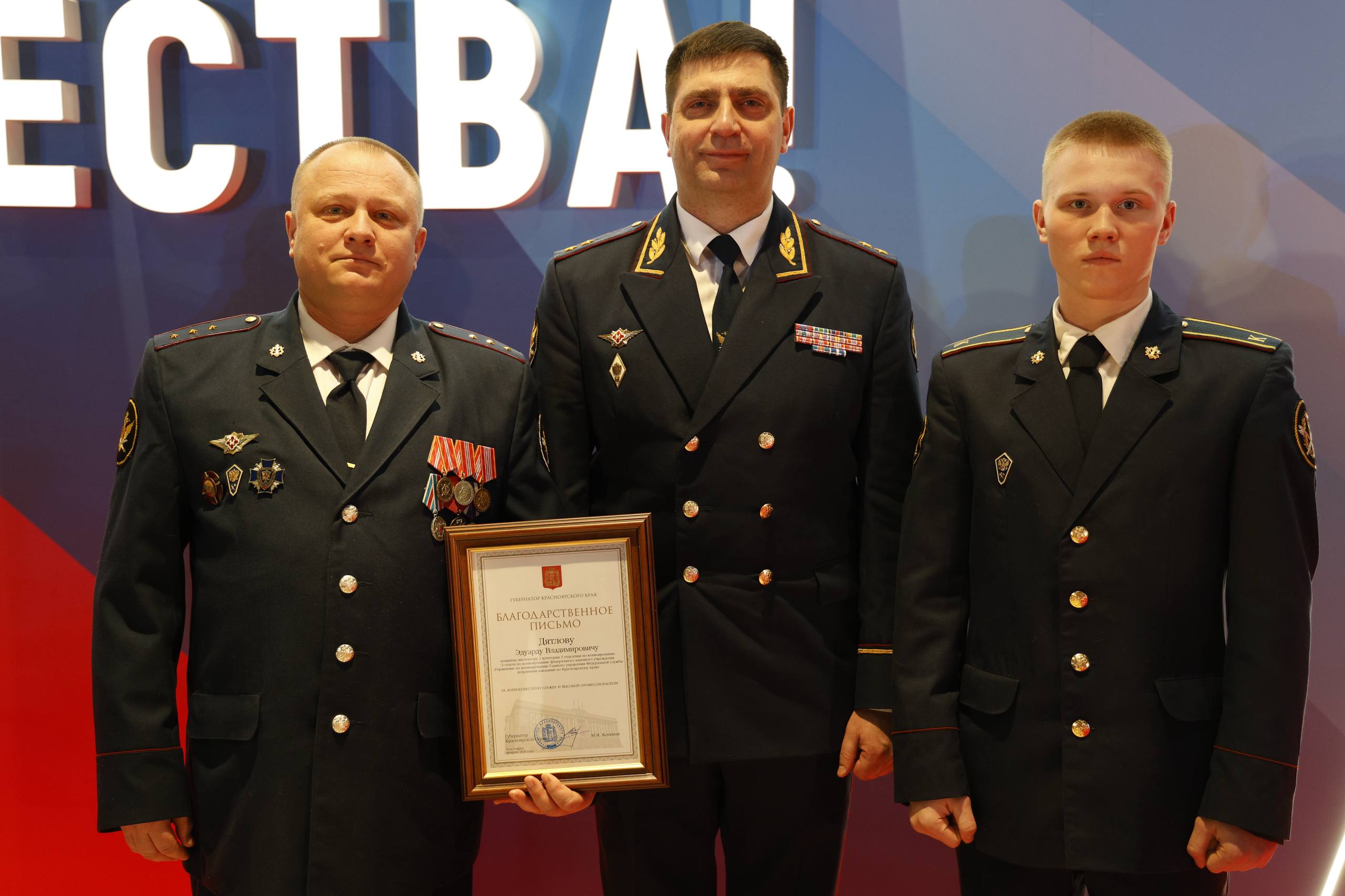Один из них — младший инспектор 1 категории 3 отделения по конвоированию 3 отдела по конвоированию УК ГУФСИН России по Красноярскому краю старший прапорщик внутренней службы Эдуард Дятлов награжден Благодарственным письмом Губернатора Красноярского края за добросовестную службу и высокий профессионализм.