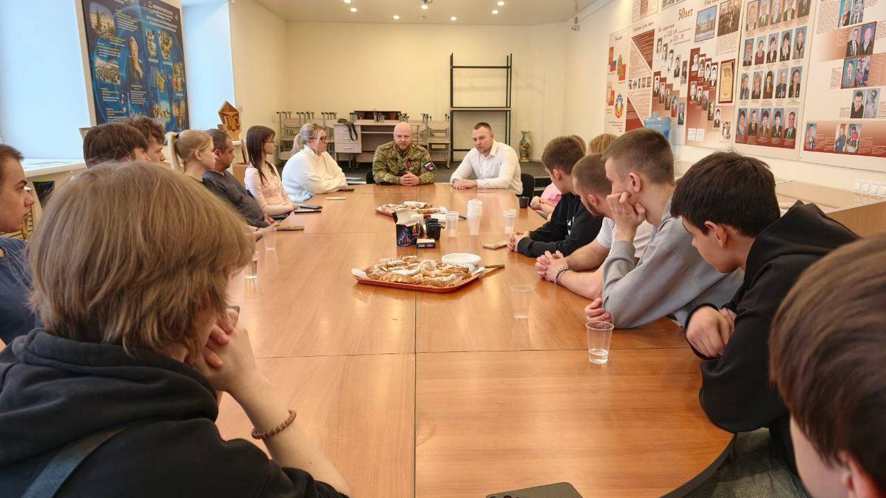 Параллельно член Общественного совета при МУ МВД России по ЗАТО г. Железногорск и социальный координатор фонда «Защитники Отечества» Эдуард Шагин организовал урок мужества для студентов.Почетным гостем стал участник СВО Дмитрий Косенко. Он рассказал ребятам о своем пути, о специфике службы, о боевых буднях и о том, что значит защищать Родину.