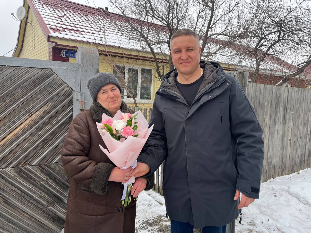 Сотрудники кадрового подразделения и член общественного совета Никита Королев пришли в гости к прекрасным дамам с букетами цветов и подарками.