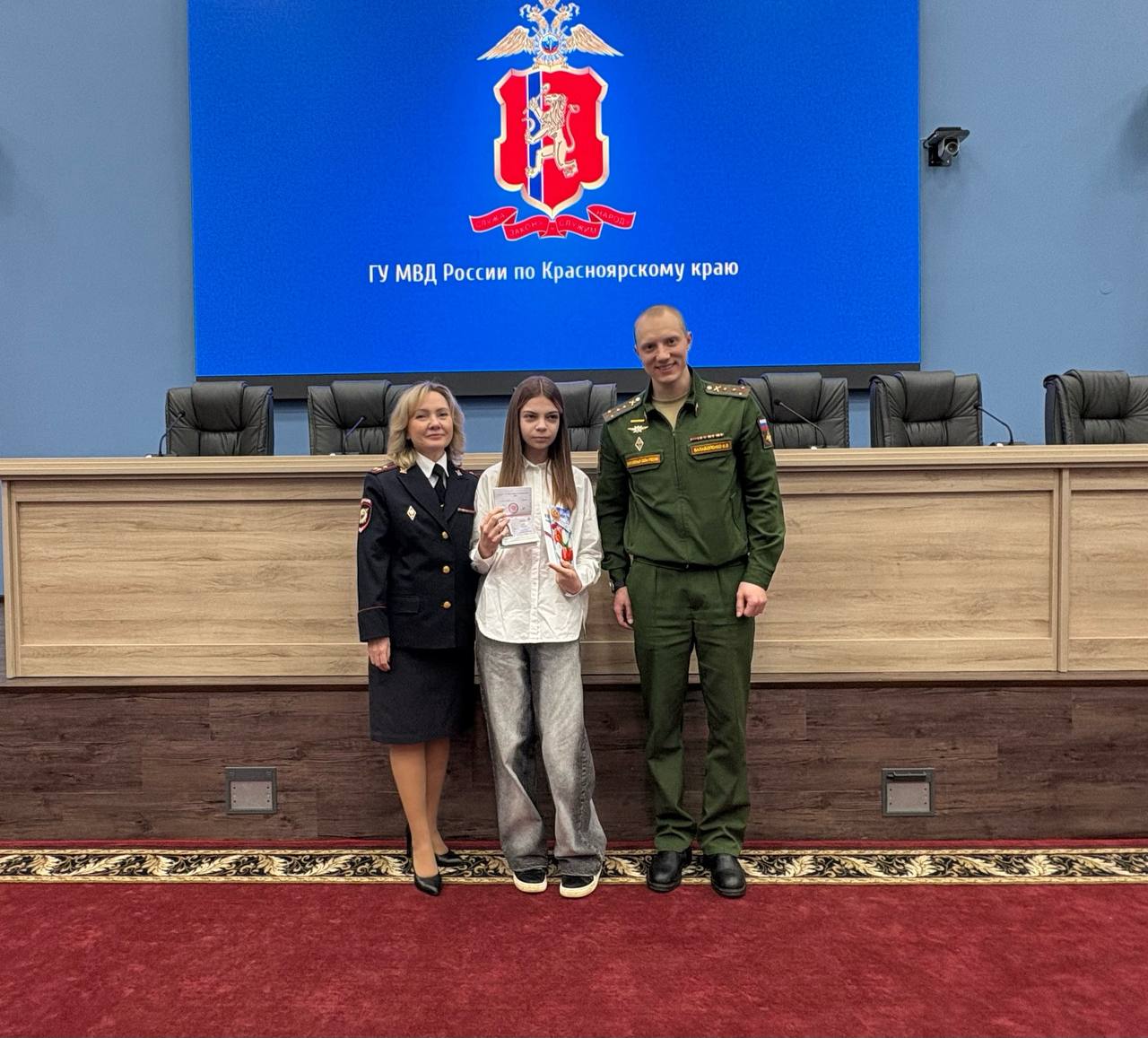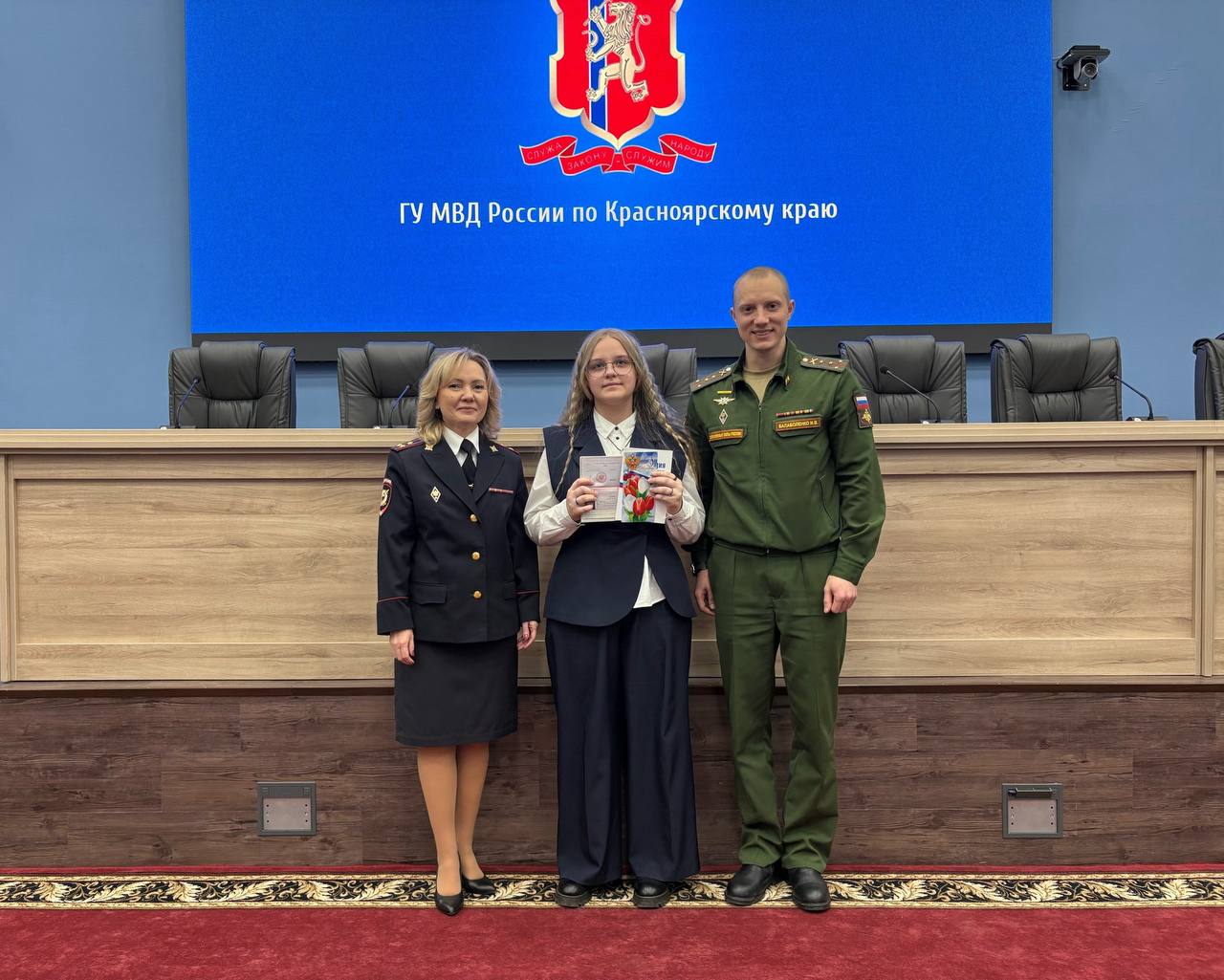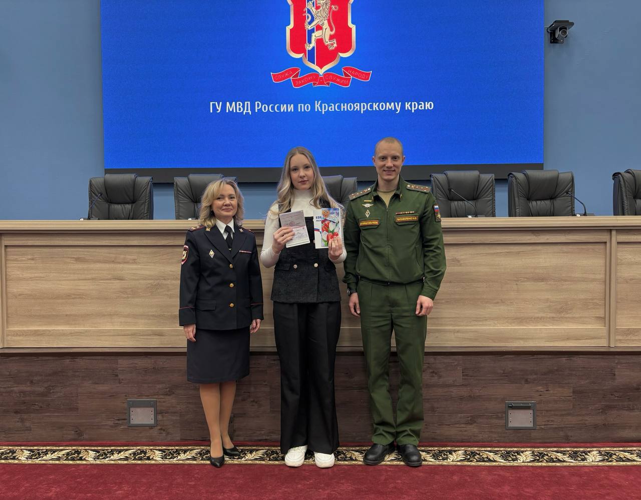 Паспорта школьницам вручали врио начальника Управления Ирина Григорьева и член Общественного совета при Главном управлении МВД России по краю, председатель Красноярской региональной общественной организации «Союз ветеранов специальной военной операции» Игорь Балаболенко.