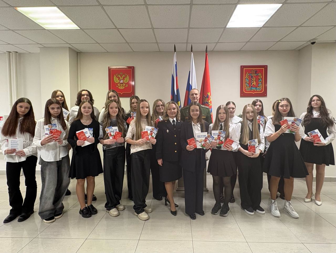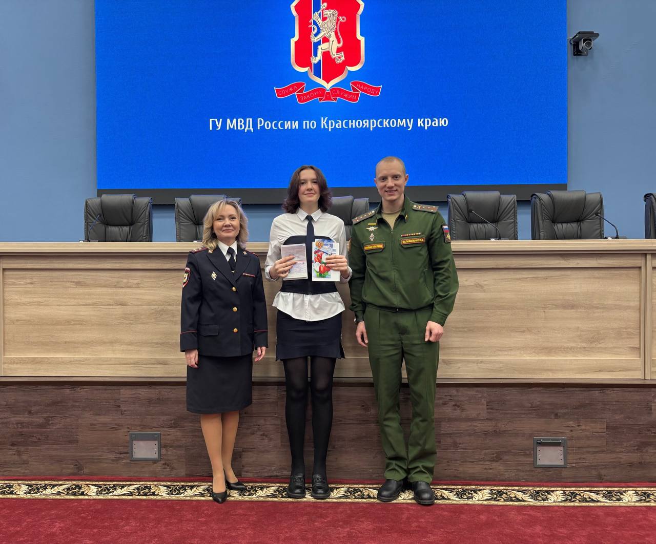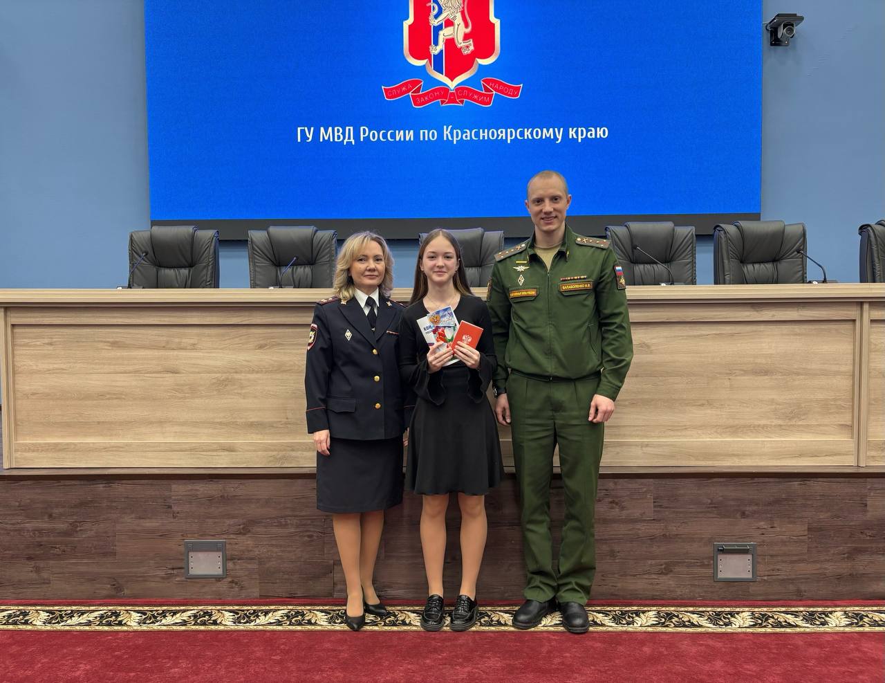 Паспорта школьницам вручали врио начальника Управления Ирина Григорьева и член Общественного совета при Главном управлении МВД России по краю, председатель Красноярской региональной общественной организации «Союз ветеранов специальной военной операции» Игорь Балаболенко.