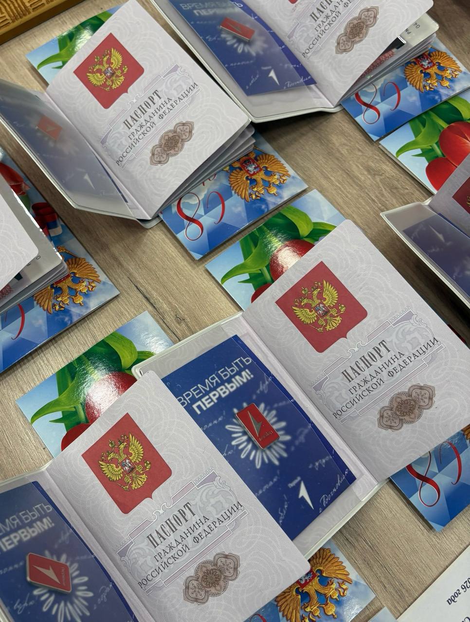 Вместе с главным документом гражданина каждая девушка получила экземпляр Конституции России, а также нагрудный значок и обложку для паспорта от Всероссийского объединения детей и молодежи «Движение первых».