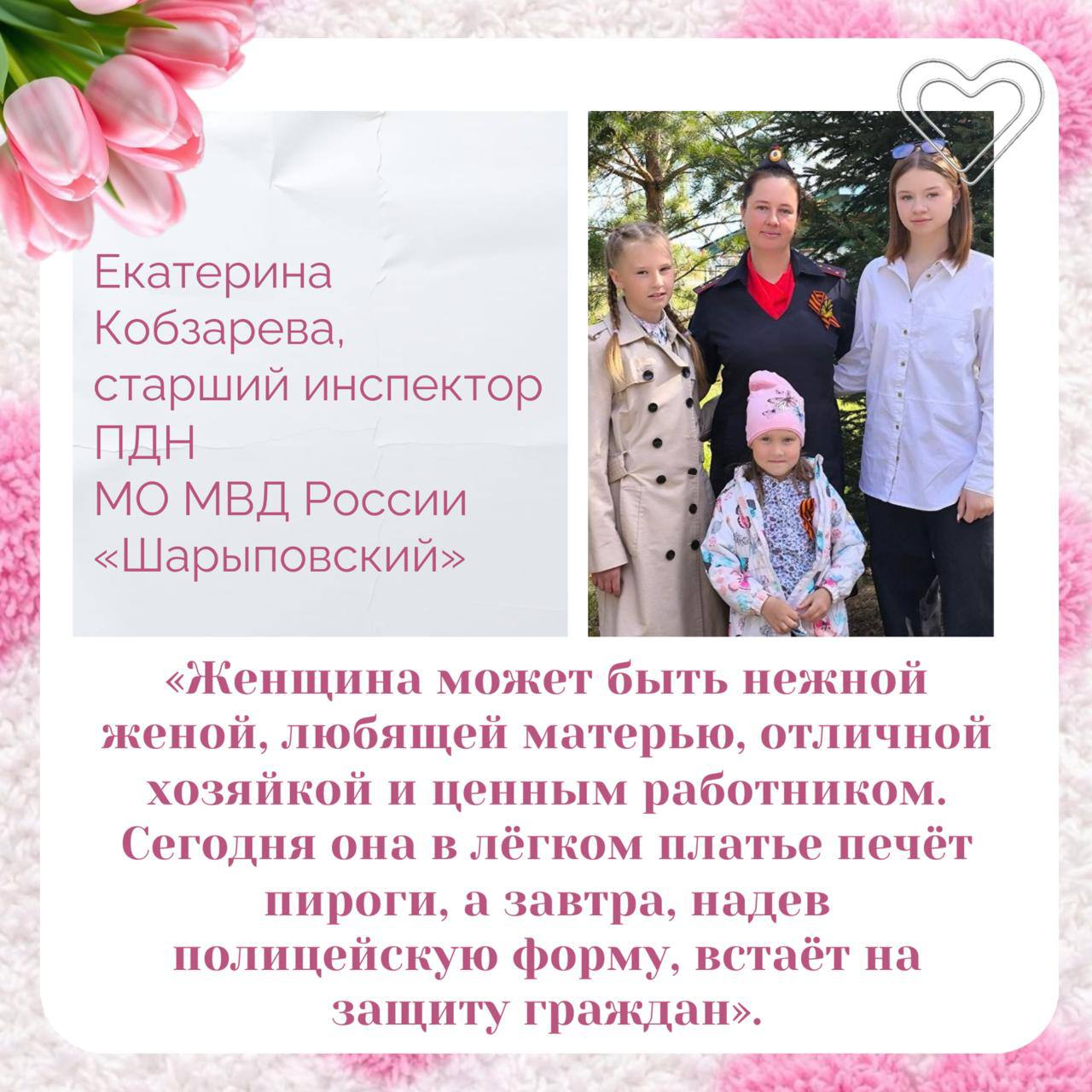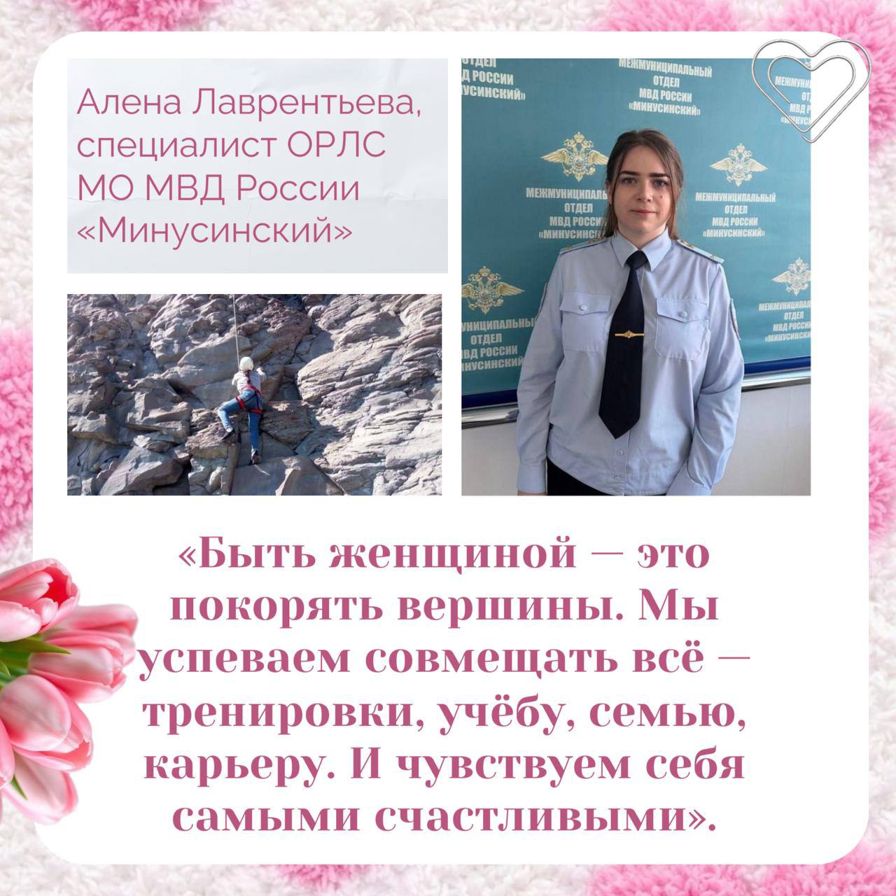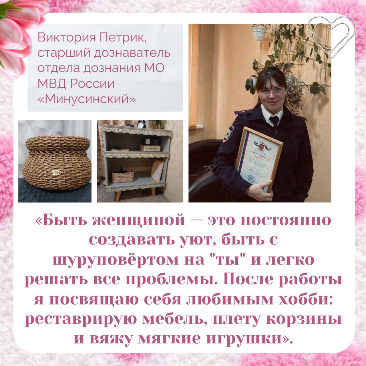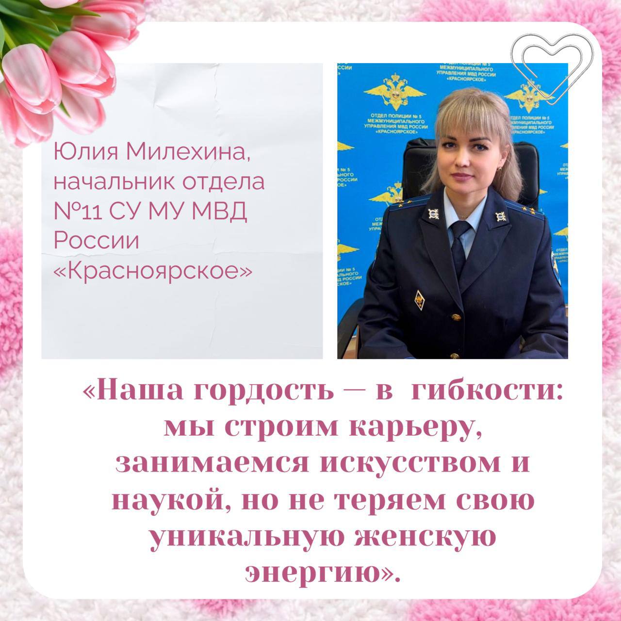 В серии карточек «Быть женщиной — это гордость» сотрудницы полиции рассказали о внутренней силе и твёрдости характера, а ещё о своих увлечениях в свободное от службы время.