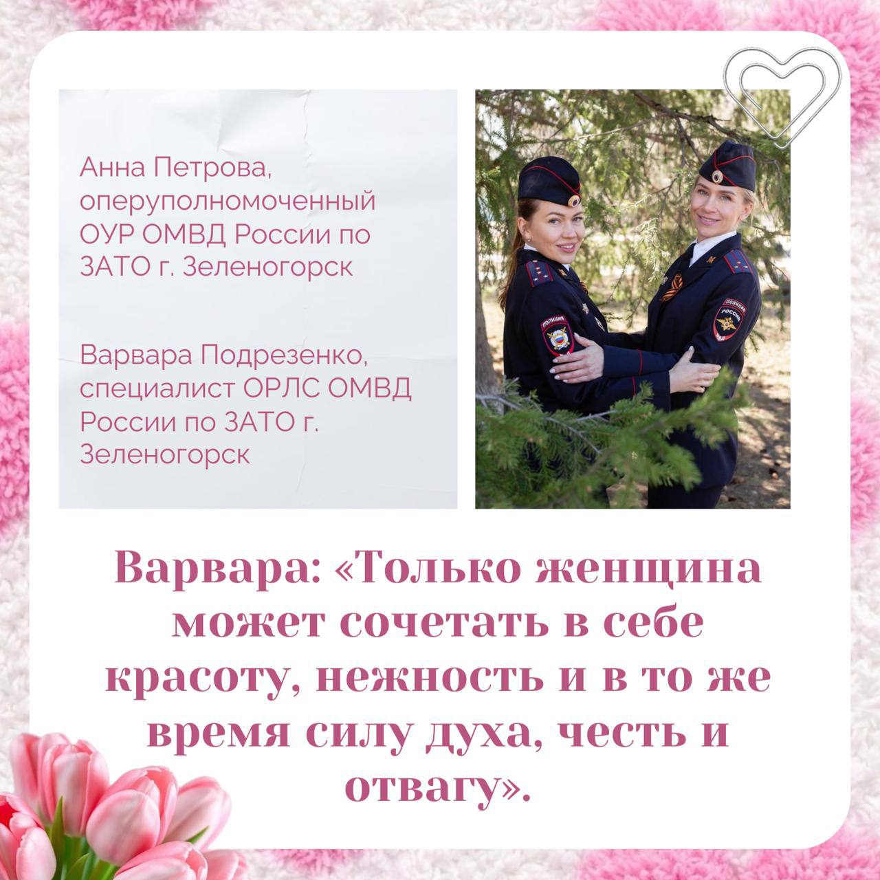В преддверии 8 Марта хотим рассказать про наших чудесных сотрудниц. Они ежедневно отдают все силы службе в ОВД и при этом успевают быть нежными, красивыми и невероятно талантливыми!