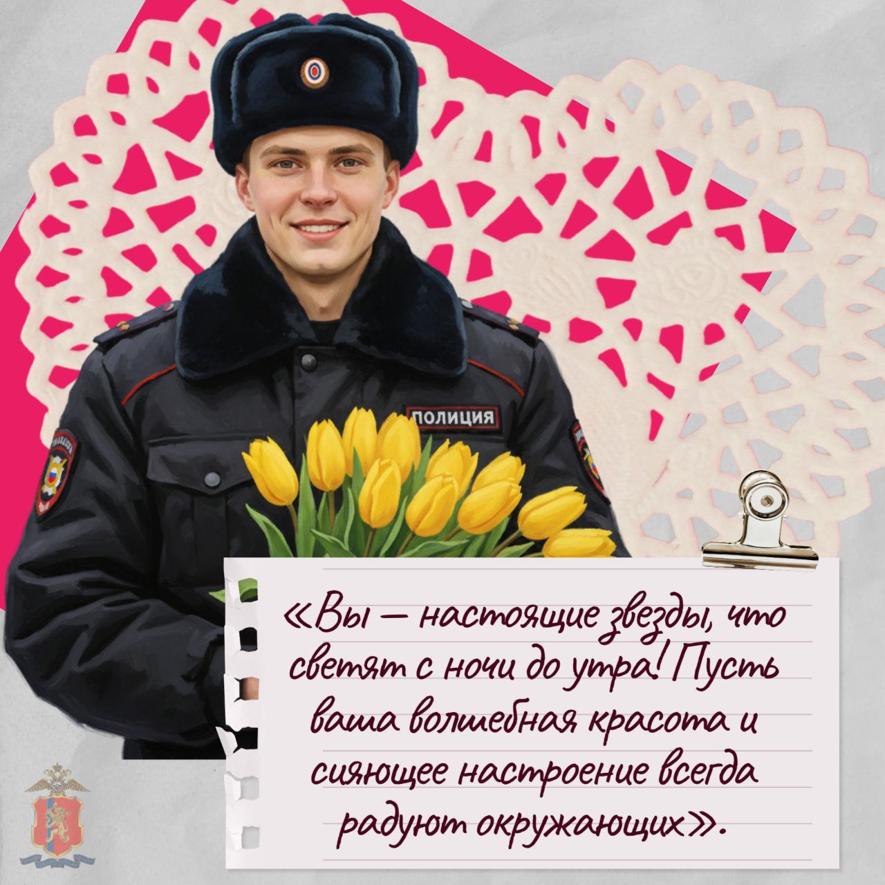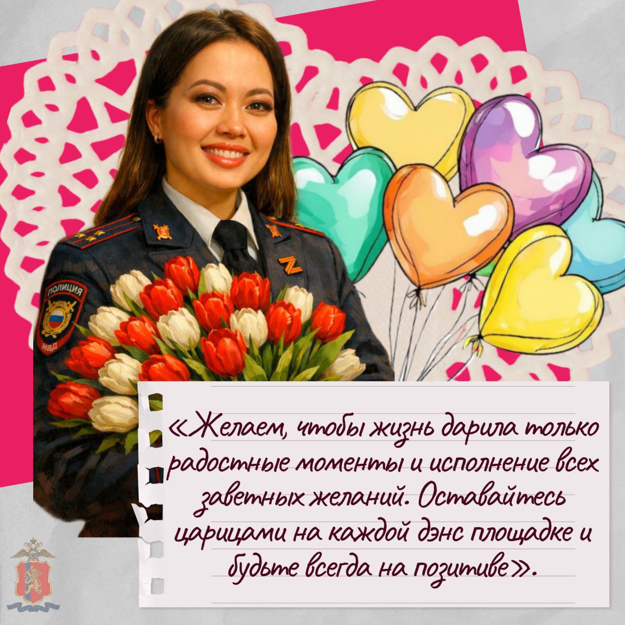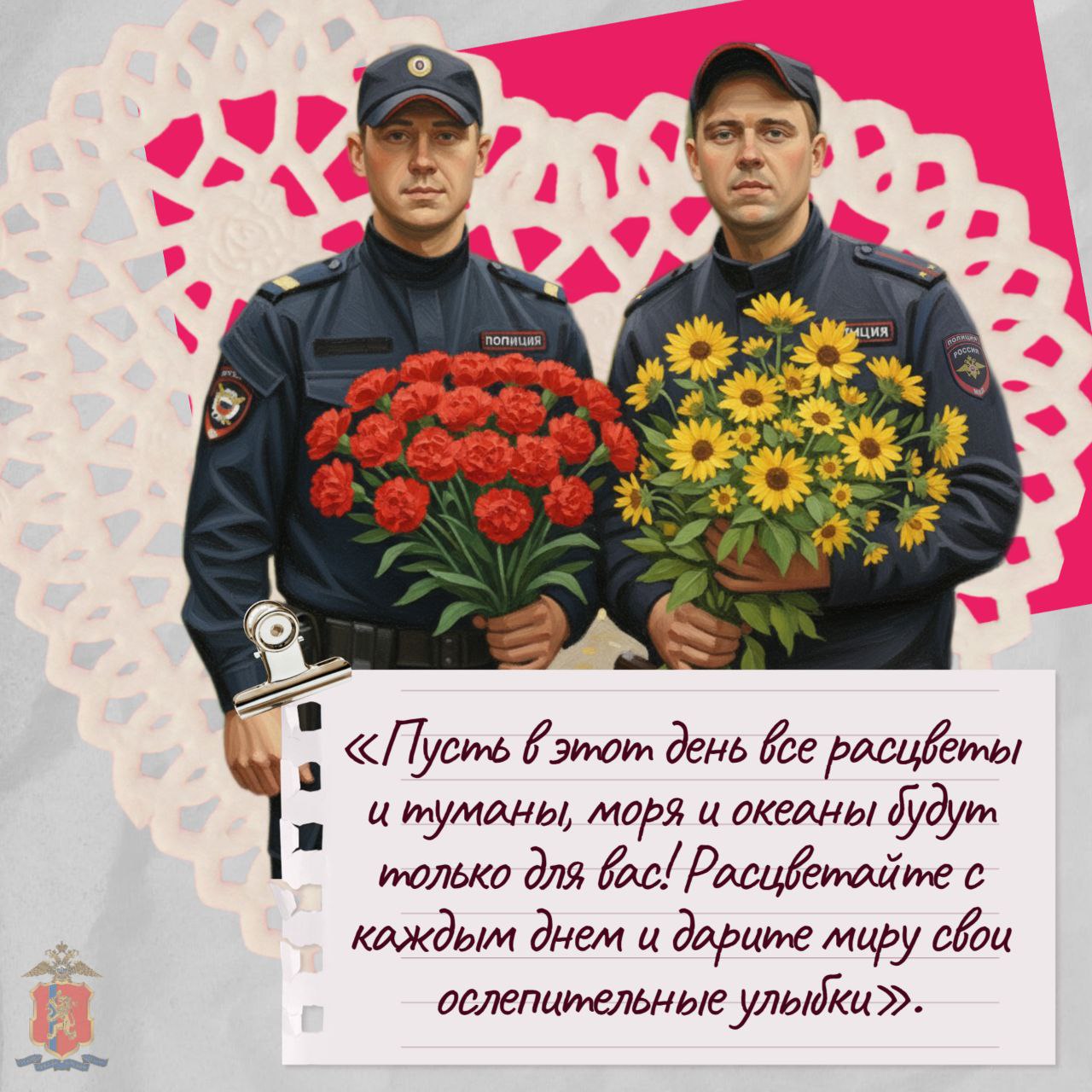 Желаем вам крепкого здоровья, неиссякаемой энергии, благополучия вашим семьям и, конечно, успехов в важной службе! Пусть ваша красота с каждым днём расцветает всё ярче и радует окружающих.