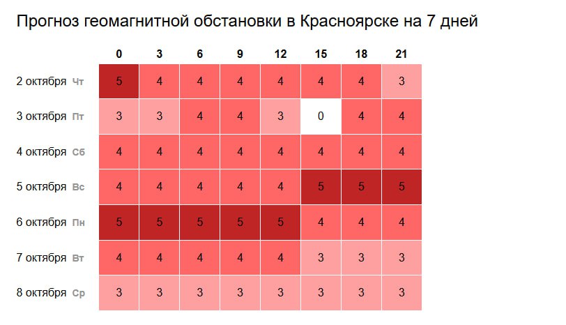 Первая декада октября будет напряженной: возмущения в геомагнитном поле усилятся от трех до пяти баллов, а пик активности придется на 5 и 6 октября. Во второй декаде буря будет в основном умеренной — с 10 по 11 октября прогнозируется пятибалльная магнитная буря, затем показатели снизятся до четырех баллов, а к середине месяца — до двух.