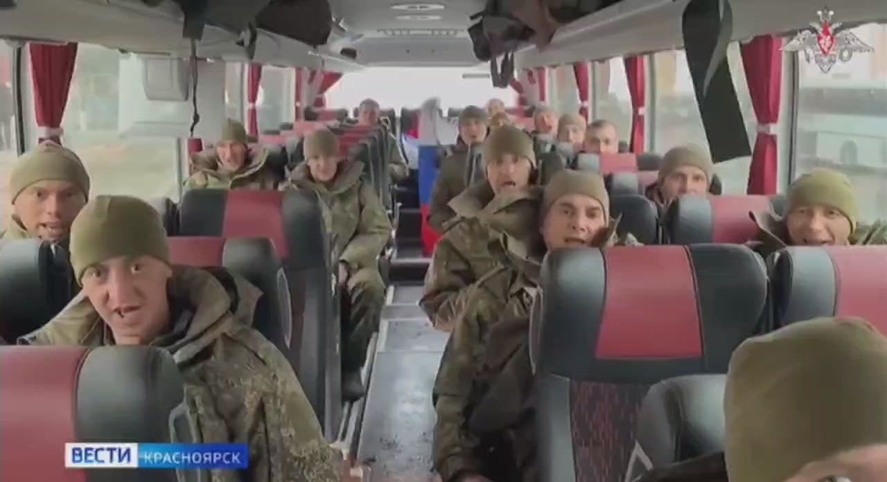Всего после обмена на родину вернулись 185 человек. На кадрах, опубликованных Министерством обороны России, группа военных с бело-сине-красными флагами садится в автобус автотранспортного предприятия Гомельской области Белоруссии.
