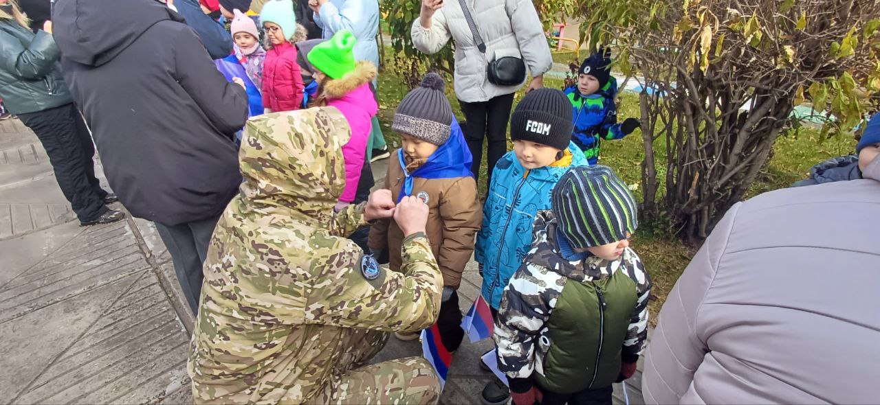 А школьники, уже ставшие «орлятами», из школы №65 повязали галстуки 92 дошколятам из 276-го детского сада. Также детей поздравил участник СВО Владимир Власюк: вместе с малышами он высадил на Аллее славы 20 декоративных саженцев пузыреплодника. В память о героях и в честь нового статуса юных «Орлят».
