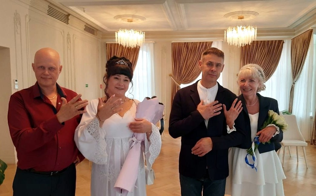 Например, двойная свадьба прошла в Минусинском ЗАГСе. Александр и Светлана Масловы и Шалтыковы Алексей и Альбина давно дружат, поэтому решили одновременно зарегистрировать брак и вместе отпраздновать важное семейное событие.