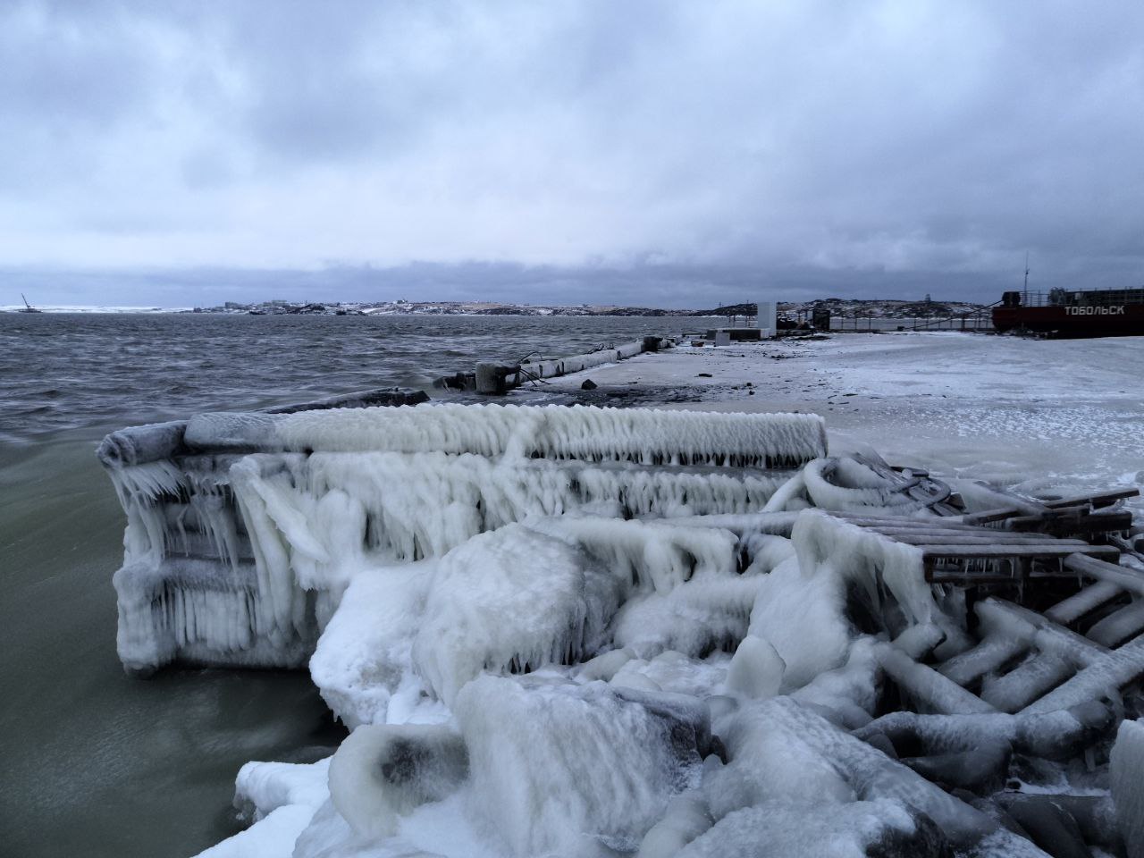 Взгляните, как преобразилось побережье возле поселка Диксон после мощного осеннего шторма при морозе. Стихия буквально на всем оставила свой отпечаток. Обратите внимание, под каким углом застыли сосульки!