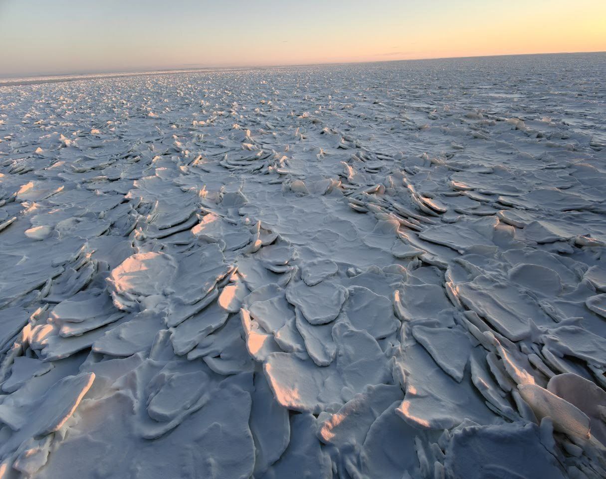 Лёд такой замысловатой формы образовался из-за ветра. Его сильные порывы поднимали лёд с поверхности залива, а мороз быстро схватывал открывшуюся воду. Льдины наползали друг на друга, образовывая чешуйки.