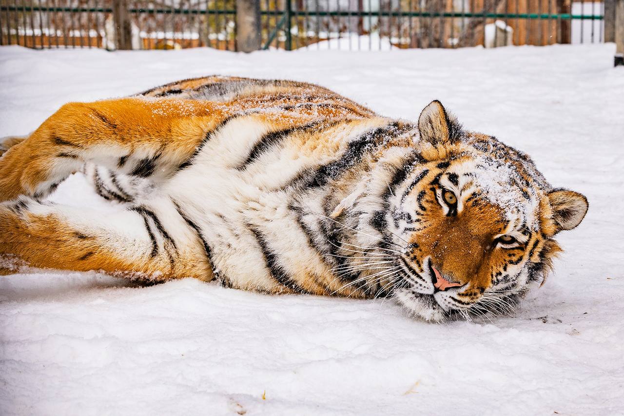 Тигрица Рокси из красноярского «Роева ручья» радуется снежной зиме