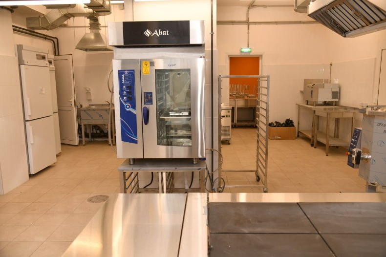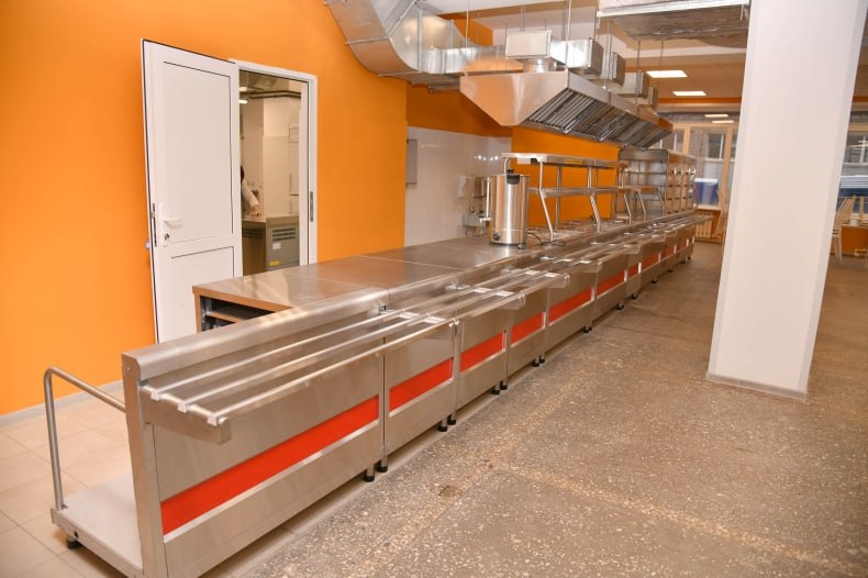 Для отремонтированного пищеблока закупили новое оборудование: холодильники, жарочные, варочные, духовые шкафы, пароконвектомат, оборудование для обработки продуктов, стеллажи, столы, стулья.