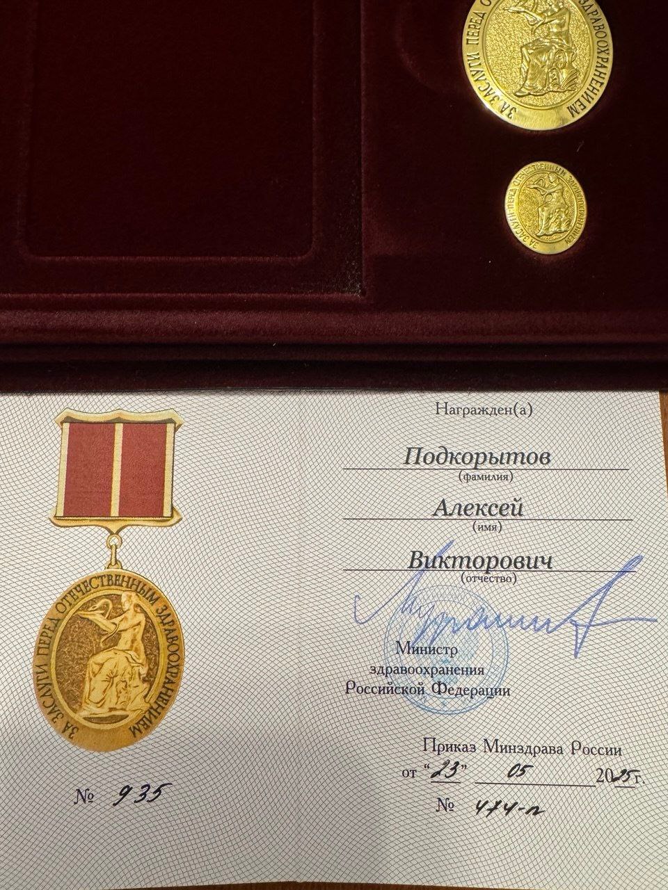 Это высшая ведомственная награда Минздрава РФ, за вклад в медицину, науку и организацию здравоохранения.
