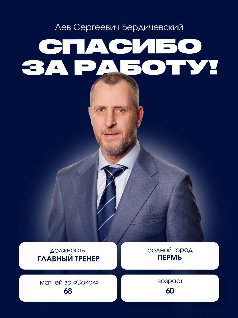 Контракт главного тренера хоккейного клуба «Сокол» Льва Бердичевского с красноярским клубом расторгнут по соглашению сторон