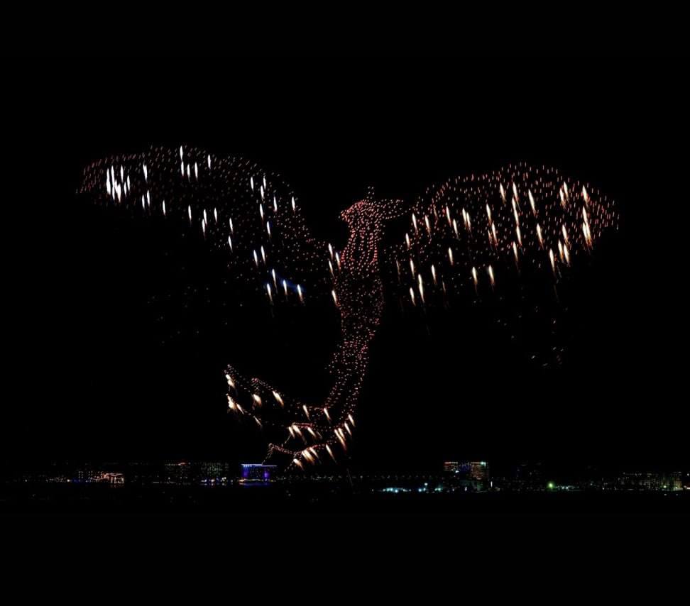 Главным элементом стало анимированное изображение феникса — символа обновления и возрождения, созданное с помощью 2300 дронов. Тысяча пиродронов формировали огненный эффект крыльев.