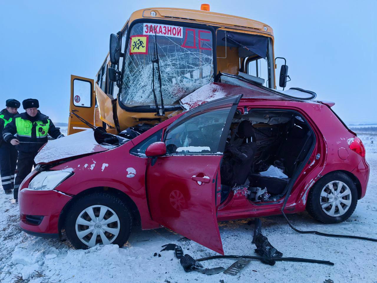 Школьный автобус и легковой автомобиль столкнулись на автодороге «Саяны» в Красноярском крае.