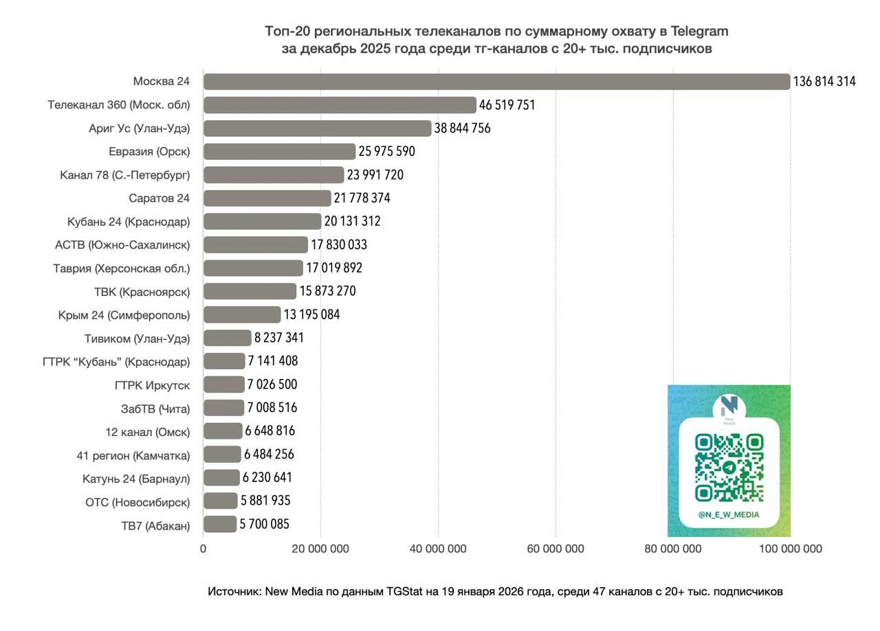 Рейтинг составил канал New Media среди Telegram-каналов телекомпаний из разных городов, у которых более 20 000 подписчиков.