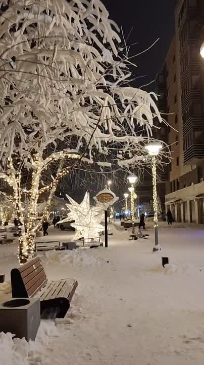 Заснеженные тротуары, скамьи и фонари создают волшебную атмосферу, а звуки вечернего города гармонично дополняют ее.