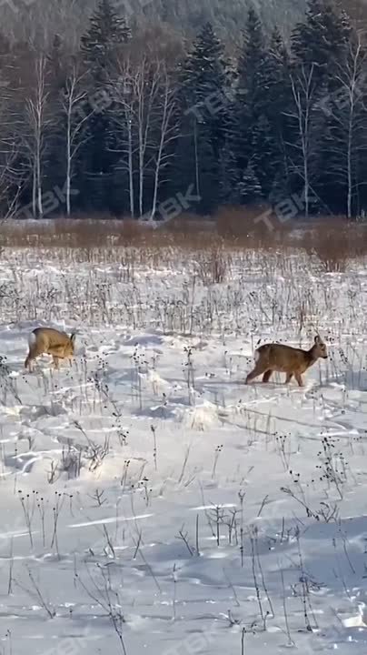 Косули вдоль дороги. Слышно, как на фоне гудят машины, а они спокойно ищут что-то под снегом не спеша
