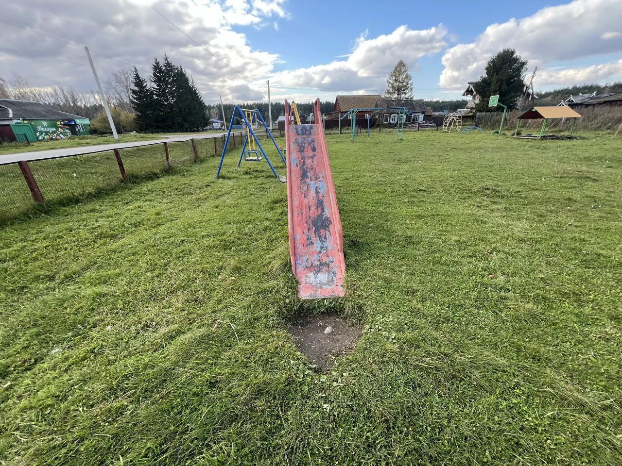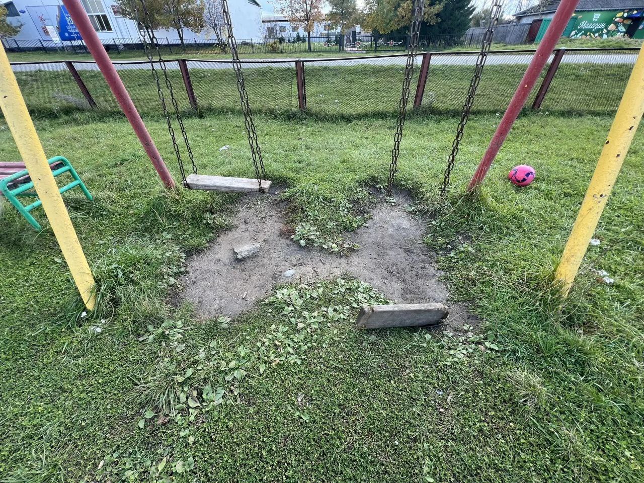 Кругом — торчащие болты, острые металлические и деревянные края, деформированная горка, качели без сидений, а в песочнице даже нет песка. Ударопоглощающее покрытие отсутствует, и любое падение может закончиться травмой.