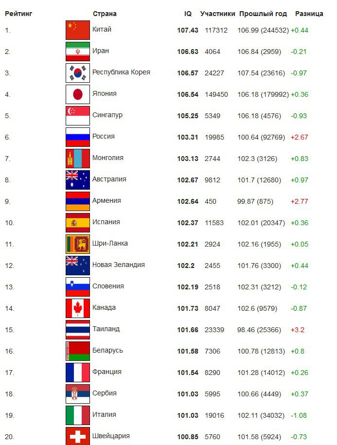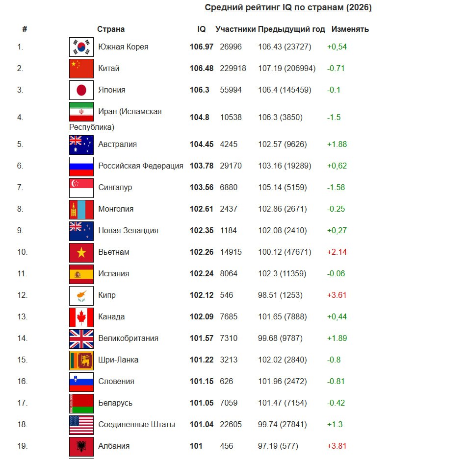 Россия заняла 6 место в мировом рейтинге стран по уровню IQ в 2026 году. Данные опубликовал портал International IQ Test. Лидером рейтинга стала Южная Корея.