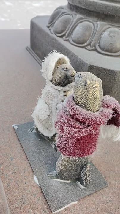 Влюбленная пара бронзовых сусликов на площади Мира в Красноярске утеплилась. Только взгляните, какие красивые наряды связали для скульптур горожане!