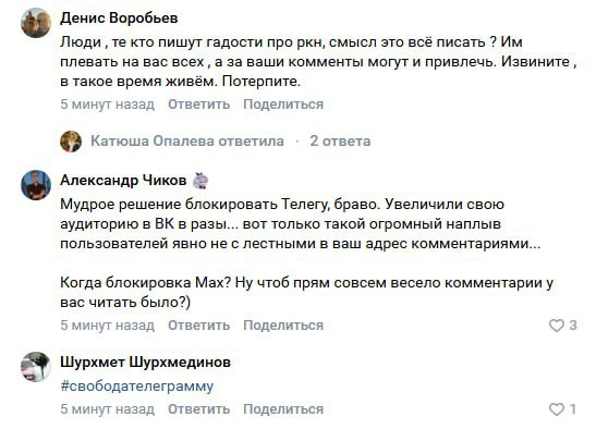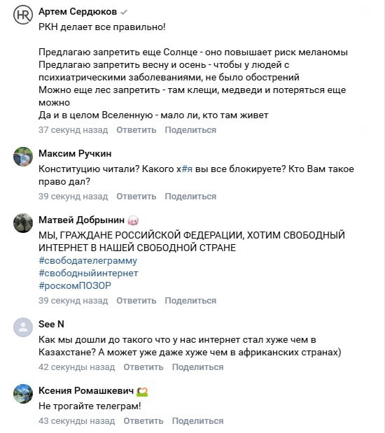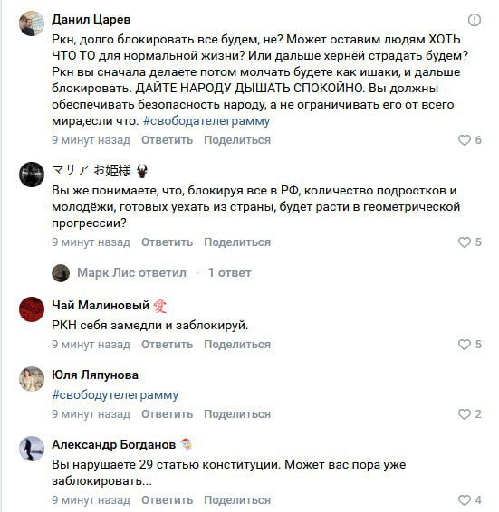 Россияне массово начали благодарить хейтить сотрудников Роскомнадзора за блокировку Telegram под последним постом ведомства в VK.