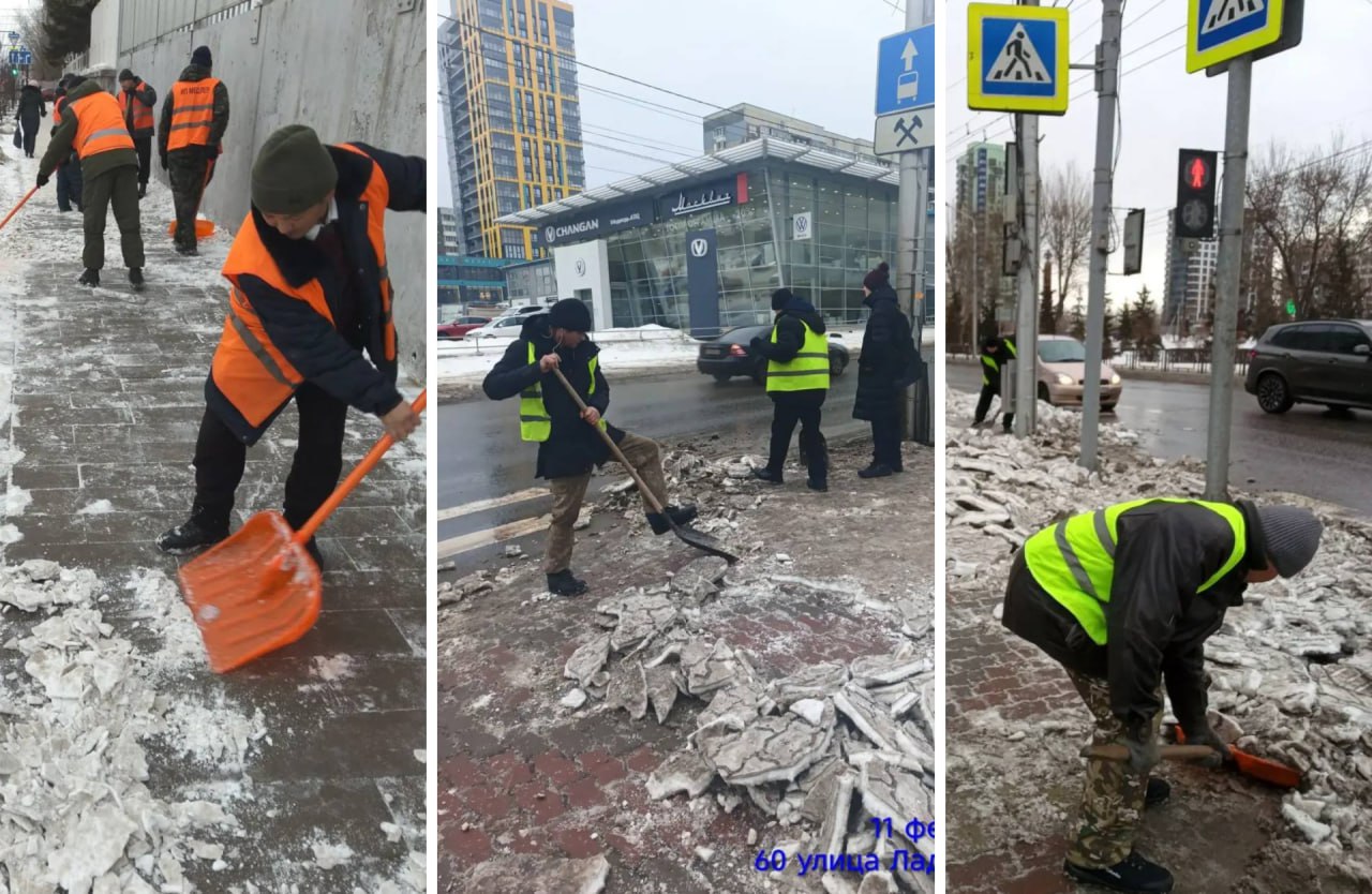 По всему городу задействовано 197 рабочих и более 80 специальных машин. Они круглосуточно очищают тротуары до асфальта, а на особо опасных участках применяют противогололедные материалы.