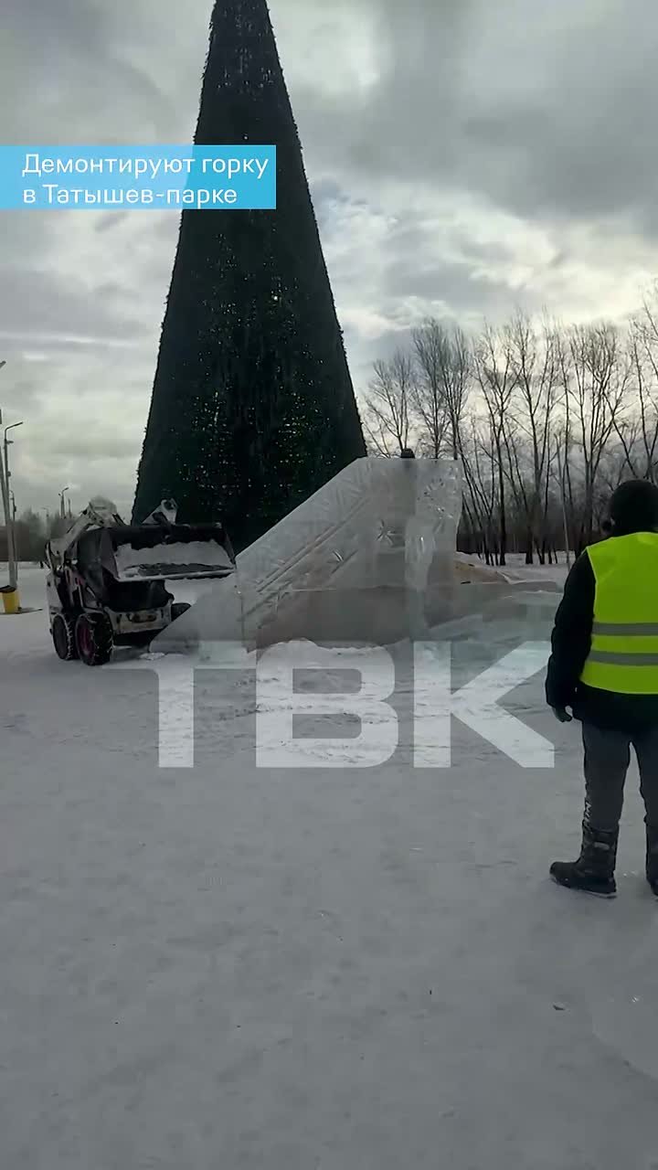 Горки демонтируют на острове Татышев. Глыбы льда падают с них, словно детали конструктора.