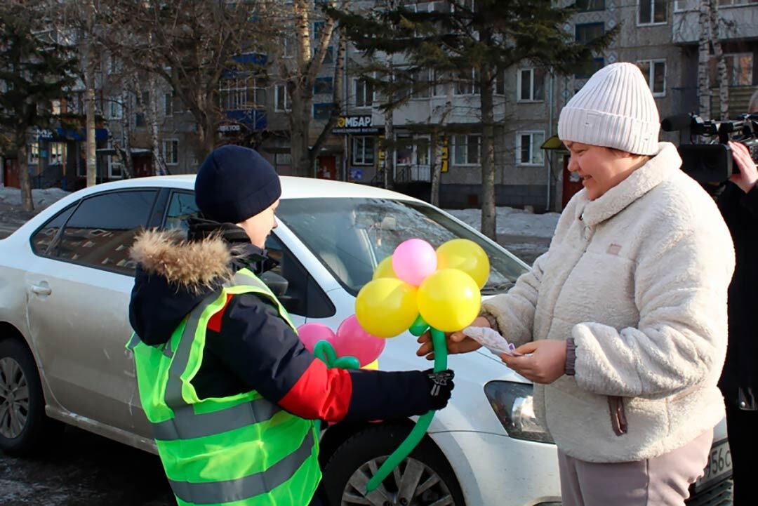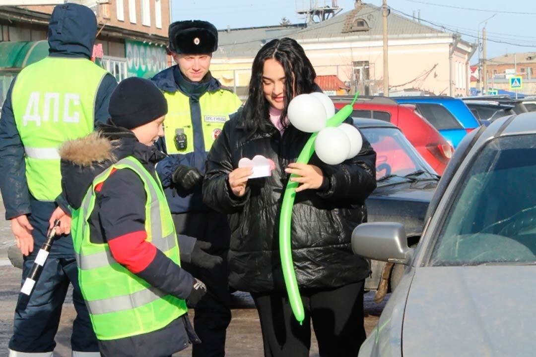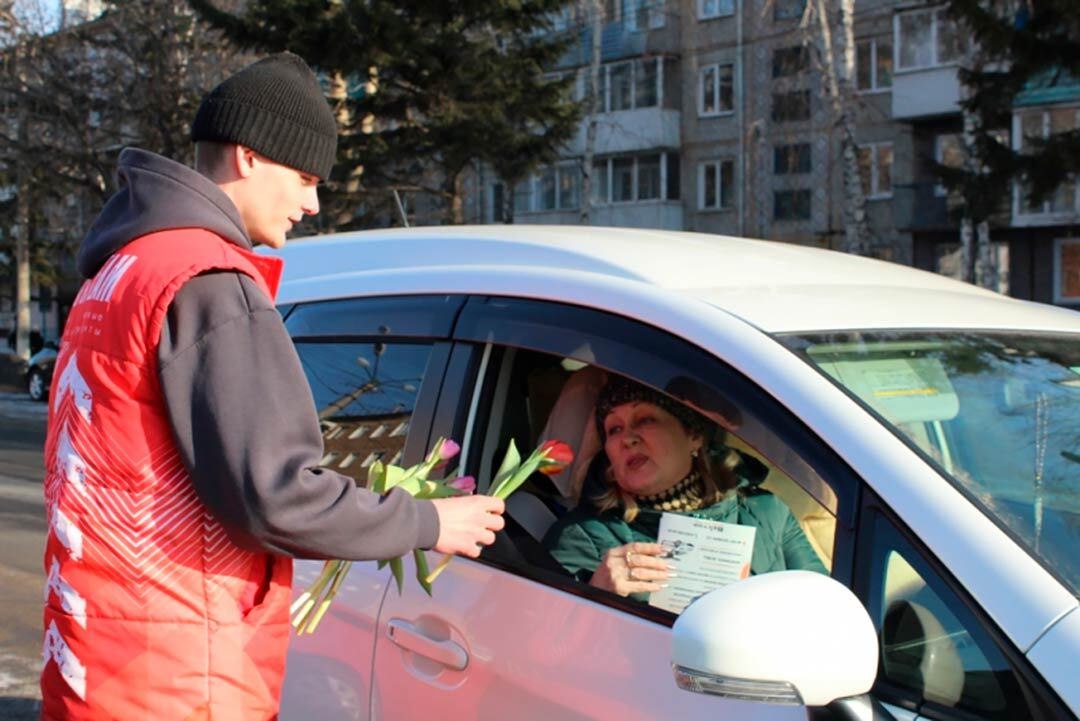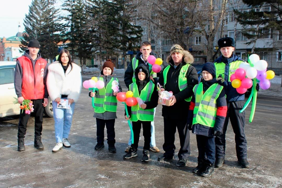 С сотрудниками канской Госавтоинспекции в акции «Цветы для автоледи» участвовали представители Академии движения, Совета отцов и отряда ЮИД школы № 6.