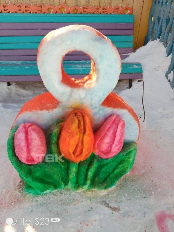 Такие яркие скульптуры из снега уже давно радуют глаз всех сельчан. Например, к 14 февраля мужчина сделал огромный букет роз с надписью «Жене».