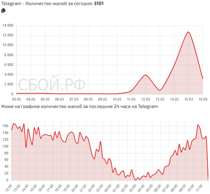 По данным сервиса «Сбой. рф», волна жалоб на работу мессенджера началась в субботу, 14 марта – о неполадках сообщили почти 6 тыс. человек. В воскресенье количество обращений увеличилось вдвое – 12 тыс. человек сообщили о сбоях.