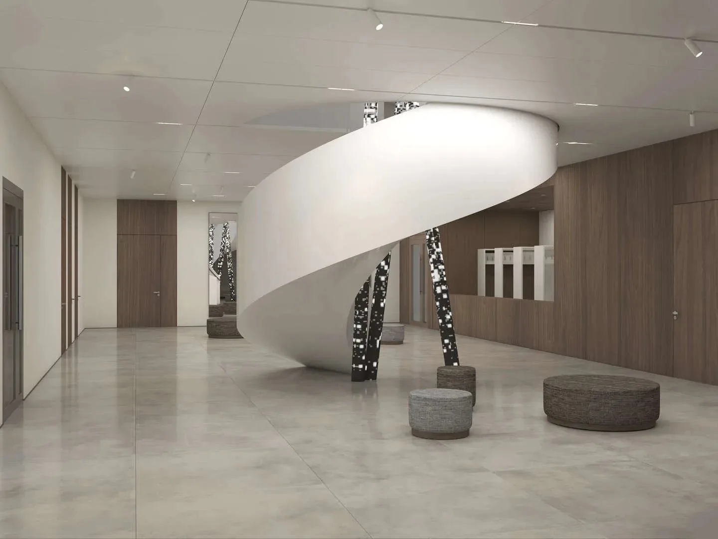 За счёт стеклянного фрагмента пола и крыши на втором этаже будет создан «световой фонарь». А на всю высоту двух этажей «вырастет» световая инсталляция – берёзы.