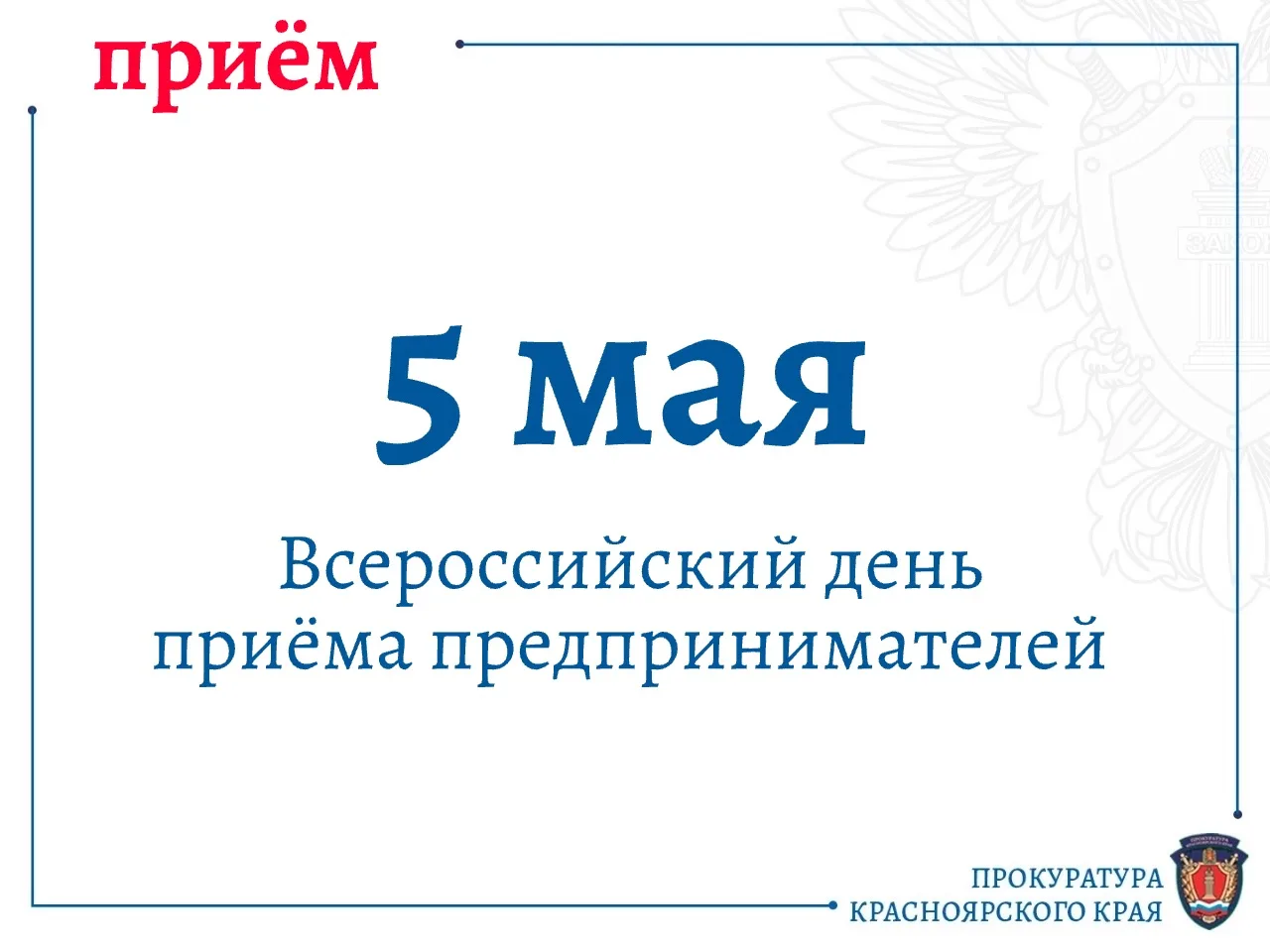 Прием предпринимателей также пройдет в прокуратурах городов и районов края 05 мая 2026 г. Их адреса указаны на сайте прокуратуры региона.