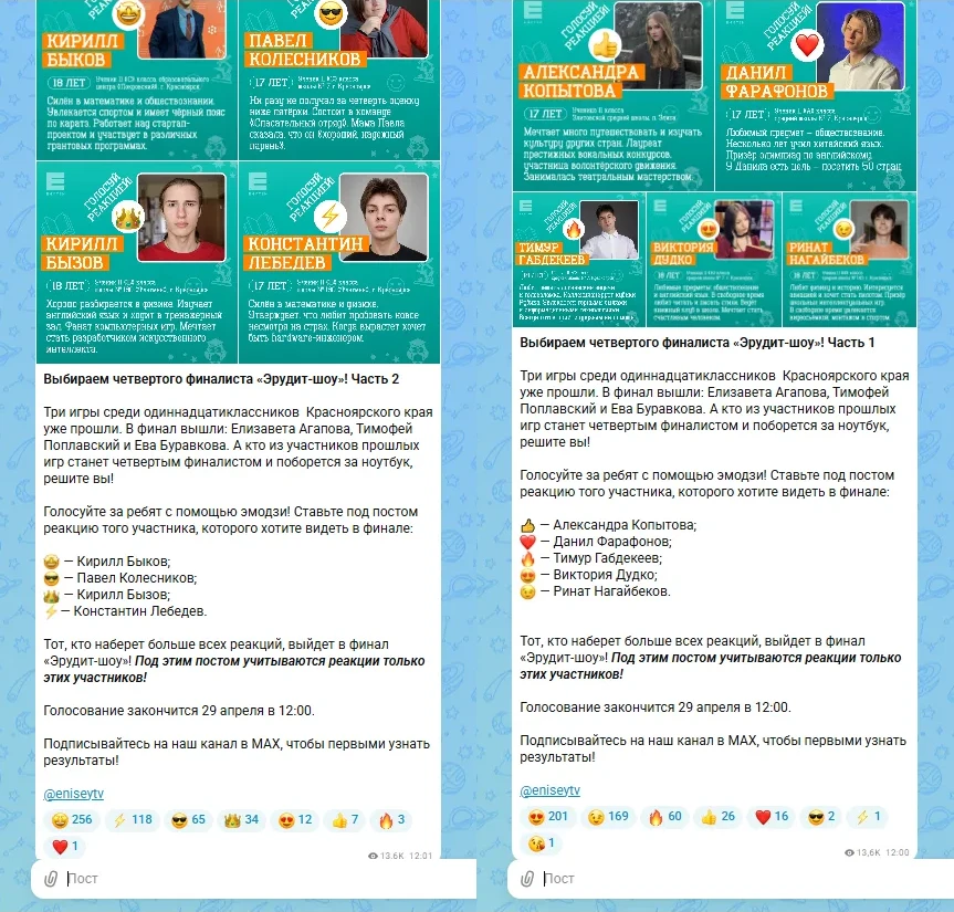 Он собрал 256 реакций в нашем голосовании. А кто из будущих выпускников получит главный приз в последней игре сезона, узнаем 16 мая в прямом эфире на телеканале «Енисей»!