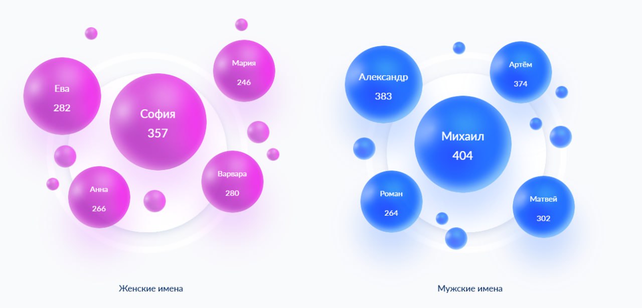 Самые популярные мужские имена: Михаил, Александр, Артем, Матвей и Роман. Из женских имен родителям больше всего нравятся: София, Ева, Варвара, Анна и Мария.