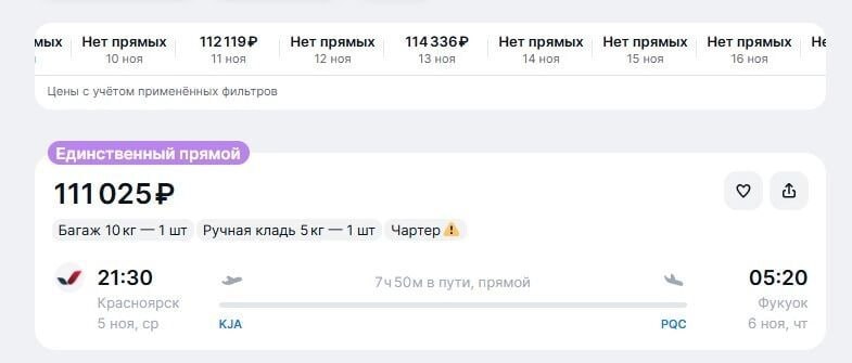 Рейсы начнут вылетать из красноярского аэропорта с 5 ноября с частотой три раза в двенадцать дней. По данным одного из самых популярных сервисов для покупки авиабилетов, прямой рейс на 7 часов 50 минут в одну сторону обойдется в 110 025 рублей.